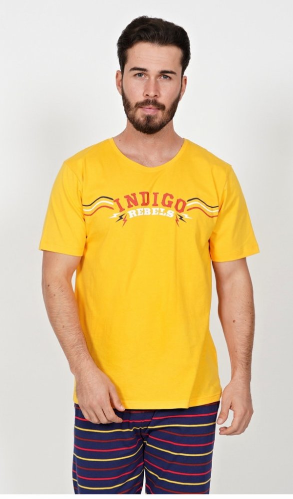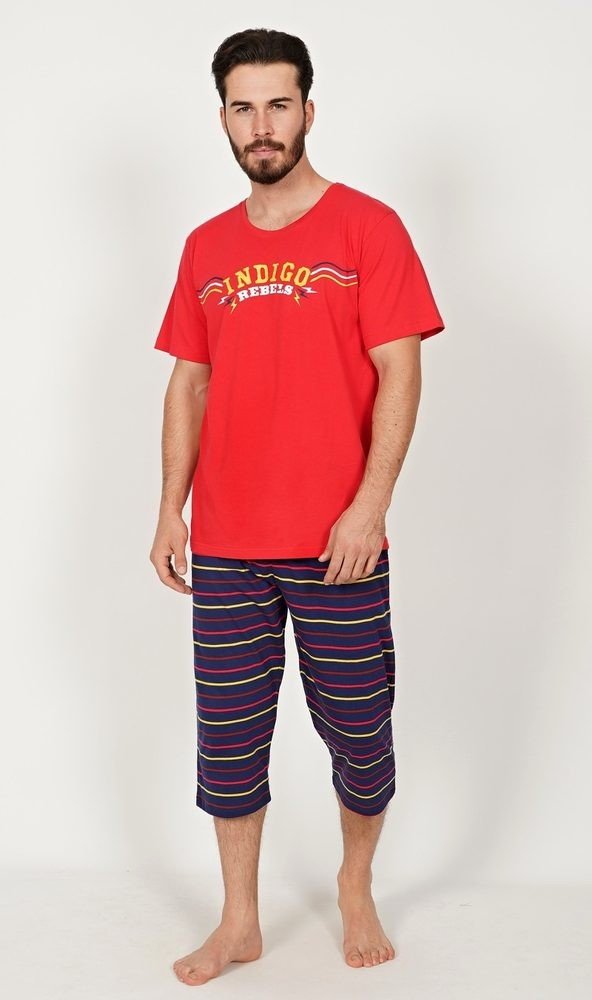 Pánské bavlněné kapri pyžamo Indigo. Pánské pyžamo se skládá z trička s krátkým rukávem a tříčtvrtečních kalhot. Na jednobarevném tričku je nápis 'Indigo rebels'. Tričko vhodně doplňují jednobarevné kalhoty pod kolena, které mají v pase gumu, šňůrku na stažení a praktické kapsy. Použitý materál s obsahem bavlny 100% je příjemný a poddajný na dotek.