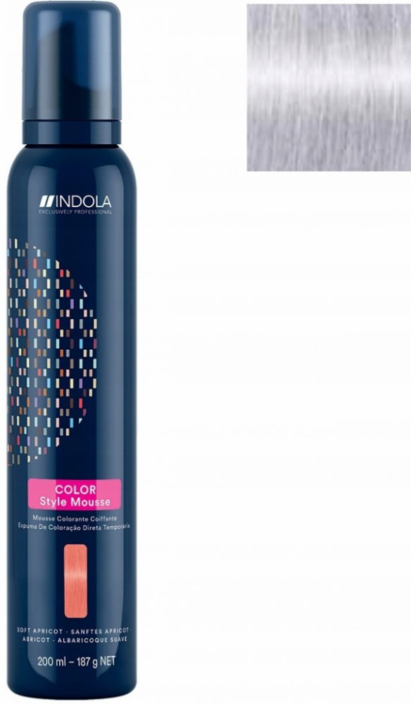 Indola Color Style Mousse Silver 200 ml. Tónovací stylingová pěna – semi-permanentní neoplachovací barva v pěně. Použití: Naneste na mokré vlasy, neoplachujte. Upozornění: Nevystavujte otevřenému ohni. Chraňte před dětmi. Vyrobeno viz Etiketa/ Kat. č. IN0325