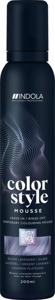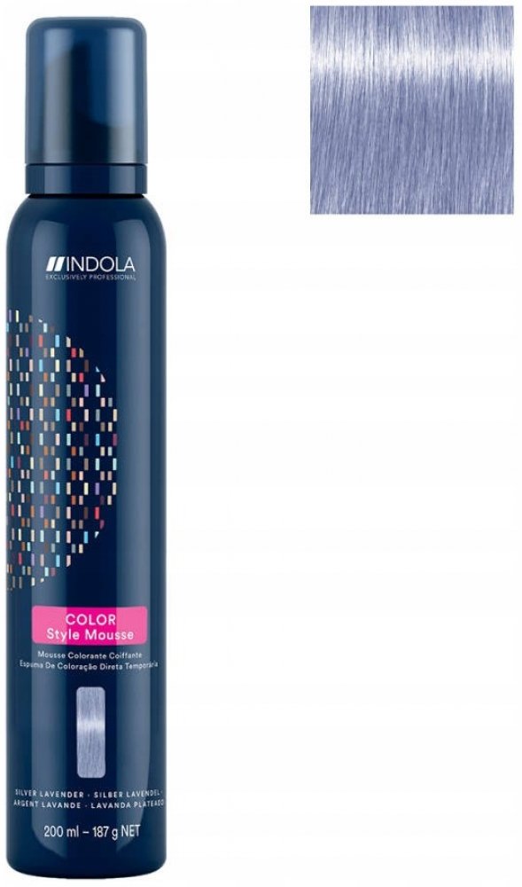 Indola Color Style Mousse Silver Lavender 200 ml. Tónovací stylingová pěna – semi-permanentní neoplachovací barva v pěně. Použití: Naneste na mokré vlasy, neoplachujte. Upozornění: Nevystavujte otevřenému ohni. Chraňte před dětmi. Vyrobeno viz Etiketa/ Kat. č. IN0326