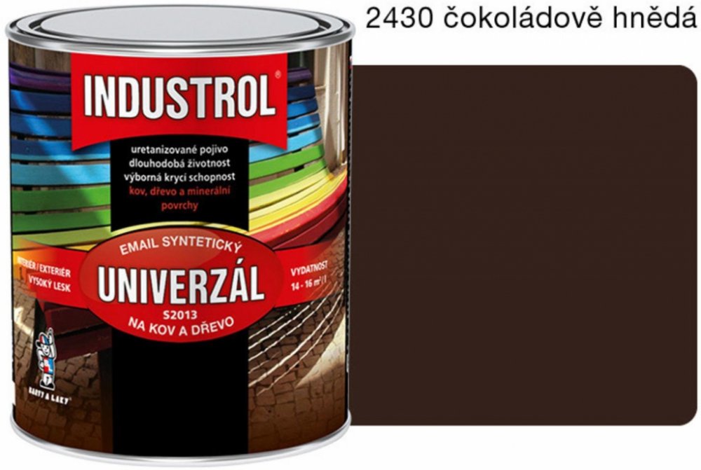 Industrol Univerzál S2013 je syntetický lesklý univerzální email. Je určen k vrchním lesklým nátěrům kovů, dřeva a jiných materiálů jako například dřevotřísky, železa, litiny, betonu, nebo zdiva. Podklad je nutno opatřit vhodnou základní nátěrovou hmotou. Email Industrol Univerzál je k dostání v široké škále atraktivních barevných odstínů. Vydatnost: 14 -16 m2 / l.