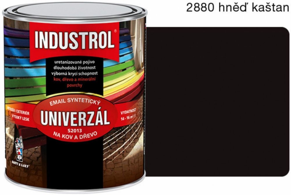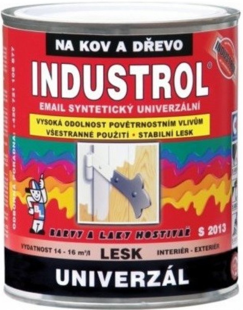 Industrol Univerzál S2013 je syntetický lesklý univerzální email. Je určen k vrchním lesklým nátěrům kovů, dřeva a jiných materiálů jako například dřevotřísky, železa, litiny, betonu, nebo zdiva. Podklad je nutno opatřit vhodnou základní nátěrovou hmotou. Email Industrol Univerzál je k dostání v široké škále atraktivních barevných odstínů. Vydatnost: 14 -16 m2 / l.