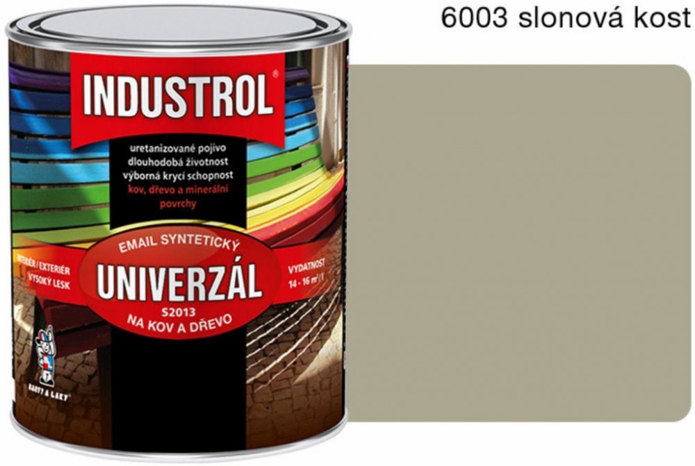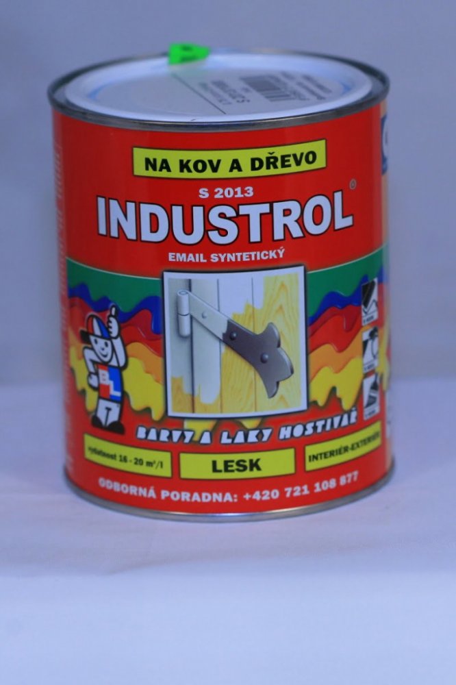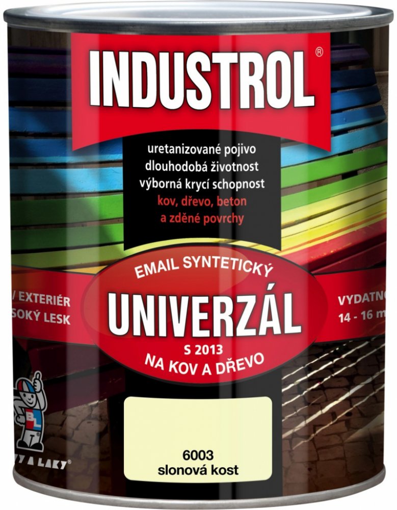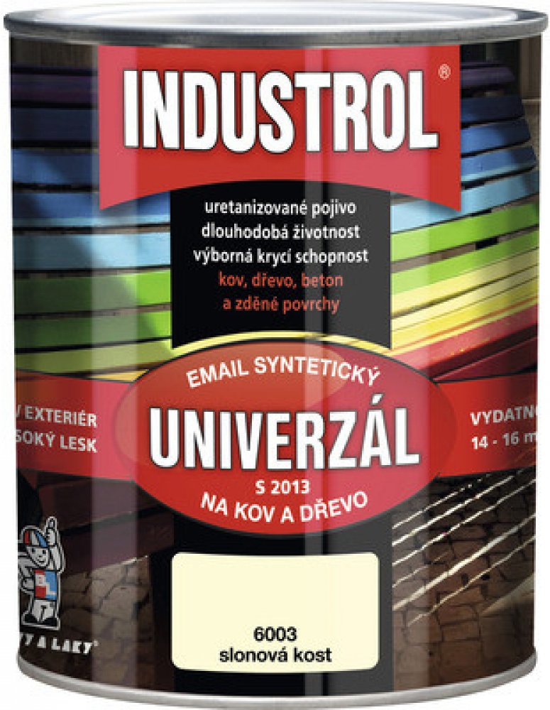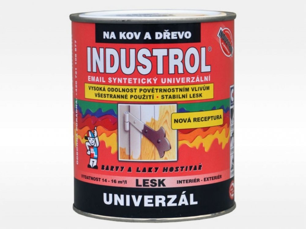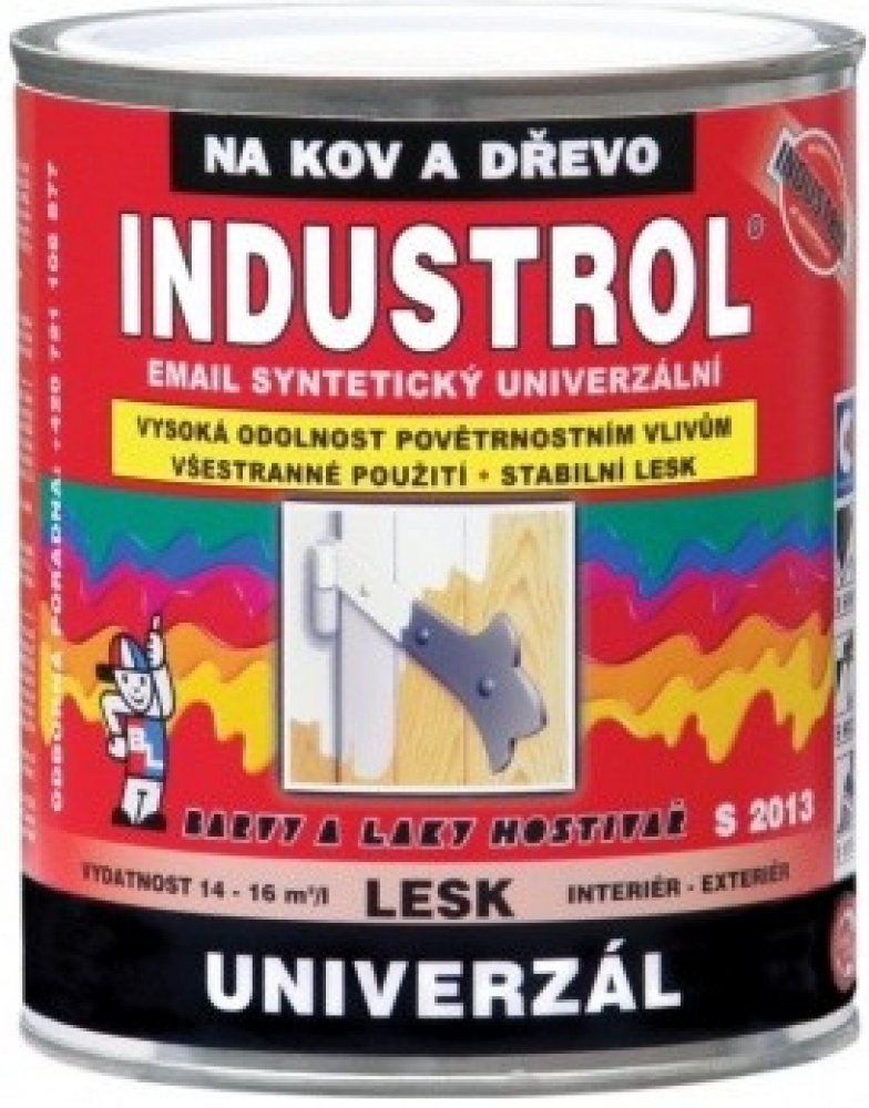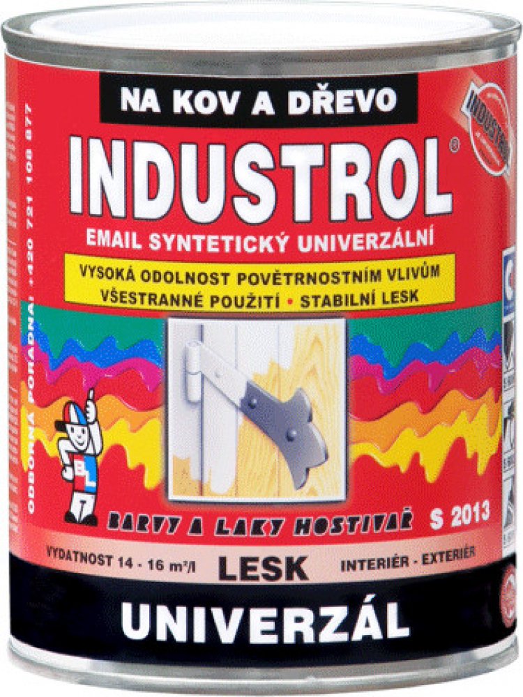 Vrchní syntetický email na kov a dřevo INDUSTROL S2013 UNIVERZÁL Vrchní lesklý syntetický email na kov a dřevo INDUSTROL S2013 UNIVERZÁL má vynikající kryvost, vysoký lesk, velmi dobrou odolnost vůči povětrnosti. Vyrábí se v široké škále odstínů RAL i BAL a dle individuálního požadavku odběratele. Výrobek má dlouhodobou skladovatelnost, během které nedochází ke změně užitných vlastností nátěrové hmoty. Výrobek je vhodný pro nátěry plotů, dveří, zárubní, parapetů, drobných konstrukcí a průmyslových předmětů, dřevěného nábytku a obložení, zahradního nábytku, omyvatelných a otěruvzdorných nátěrů stěn. Email není určen k nátěrům, které přicházejí do přímého styku s potravinami, krmivy a pitnou vodou a nátěrům dětského nábytku a hraček. Smí být používán na plochy přicházející do nepřímého styku s poživatinami, krmivy a pitnou vodou. Podrobnější informace naleznete v technickém listu k dispozici ke stažení v sekci ""Datové listy"".