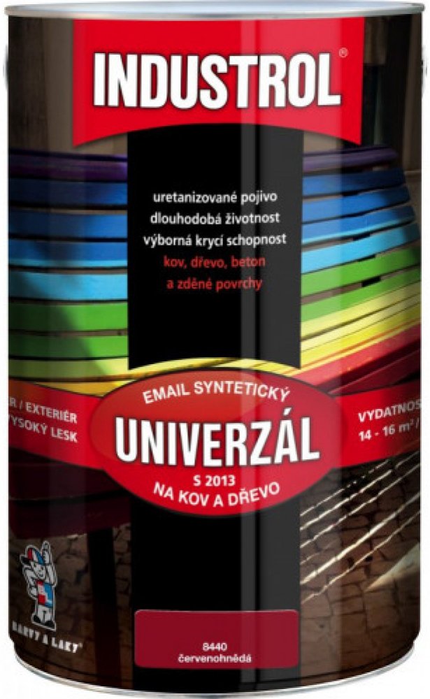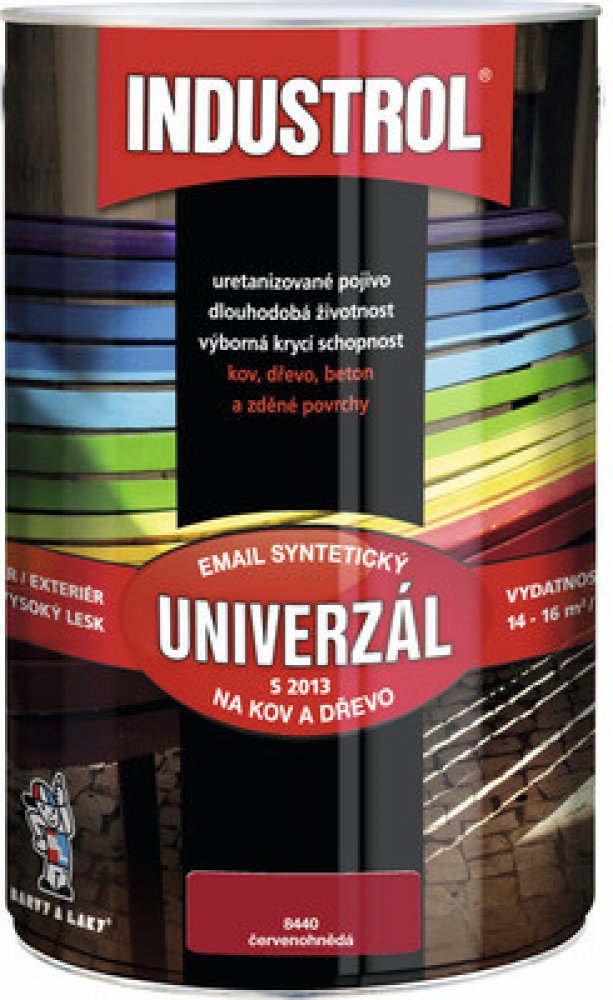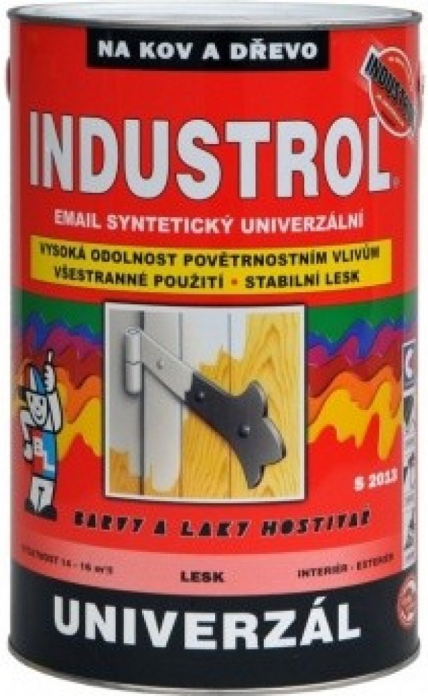 Industrol S2013 univerzál lesk vrchní barva na kov a dřevo, 8440 červenohnědá, 4 l K vrchním lesklým nátěrům kovů, dřeva a materiálů jako zdivo pro venkovní i vnitřní použití. Vynikající kryvost, vysoký lesk, velmi dobrá odolnost vůči povětrnosti.