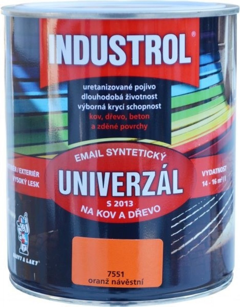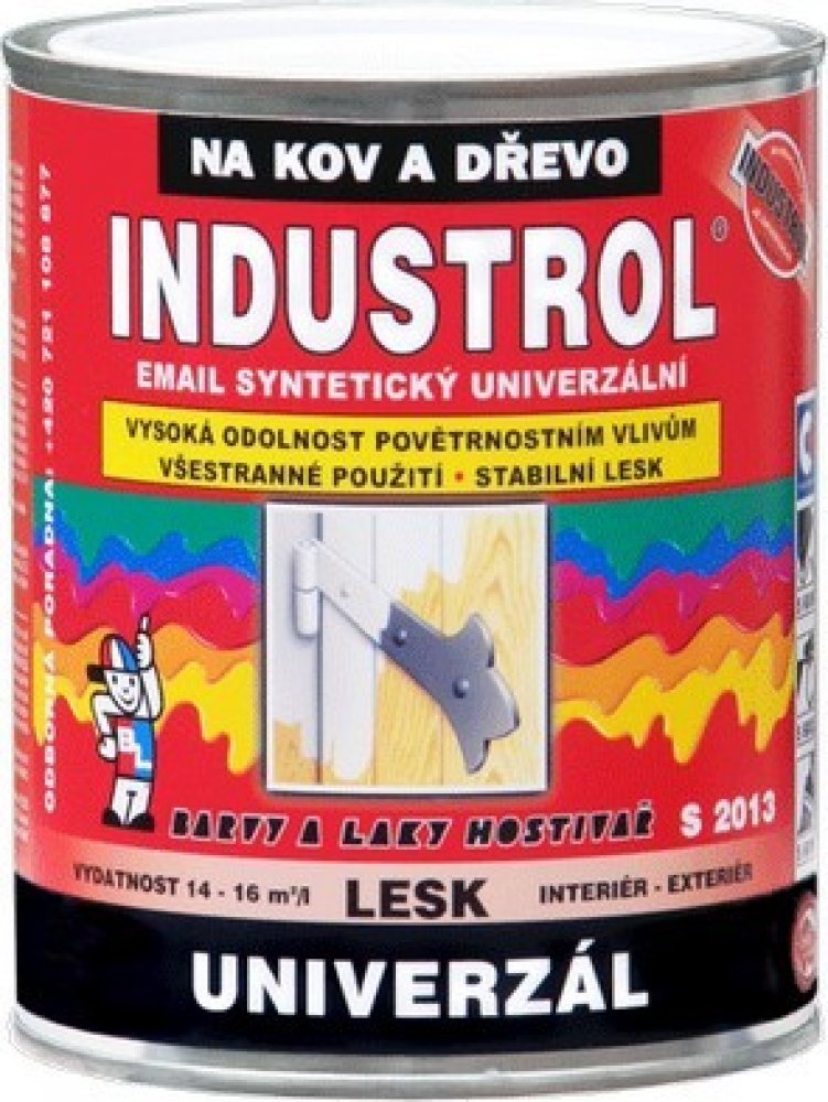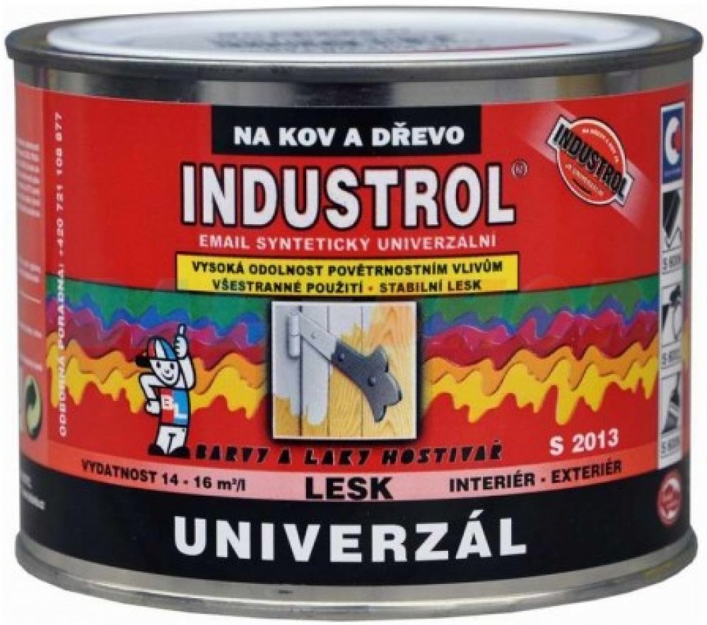 Vrchní syntetický email na kov a dřevo INDUSTROL S2013 UNIVERZÁL Vrchní lesklý syntetický email na kov a dřevo INDUSTROL S2013 UNIVERZÁL má vynikající kryvost, vysoký lesk, velmi dobrou odolnost vůči povětrnosti. Vyrábí se v široké škále odstínů RAL i BAL a dle individuálního požadavku odběratele. Výrobek má dlouhodobou skladovatelnost, během které nedochází ke změně užitných vlastností nátěrové hmoty. Výrobek je vhodný pro nátěry plotů, dveří, zárubní, parapetů, drobných konstrukcí a průmyslových předmětů, dřevěného nábytku a obložení, zahradního nábytku, omyvatelných a otěruvzdorných nátěrů stěn. Email není určen k nátěrům, které přicházejí do přímého styku s potravinami, krmivy a pitnou vodou a nátěrům dětského nábytku a hraček. Smí být používán na plochy přicházející do nepřímého styku s poživatinami, krmivy a pitnou vodou. Podrobnější informace naleznete v technickém listu k dispozici ke stažení v sekci ""Datové listy"".
