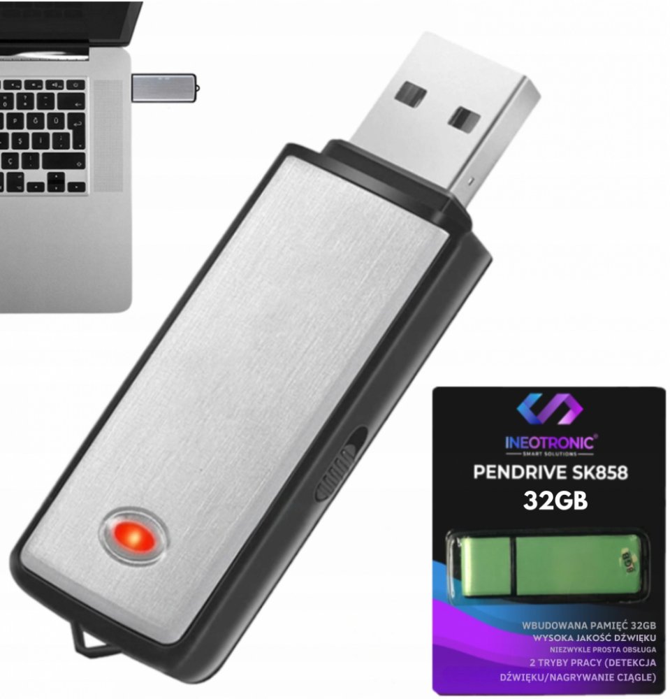 Toto zařízení je mini špionážní hlasový záznamník ve formě flash disku. Jedná se o tajný nástroj pro nahrávání zvuku, který je díky svému nenápadnému designu ideální pro diskrétní sledování konverzací nebo nahrávání důležitých událostí. Jeho hlavní funkcí je zaznamenávat zvuk ve vysoké kvalitě a přitom zajistit pohodlí a snadné použití díkyvestavěné paměti 8GB a funkci plug-and-play,která umožňuje bezproblémové připojení k počítači a přehrávání nahraných zvukových souborů.