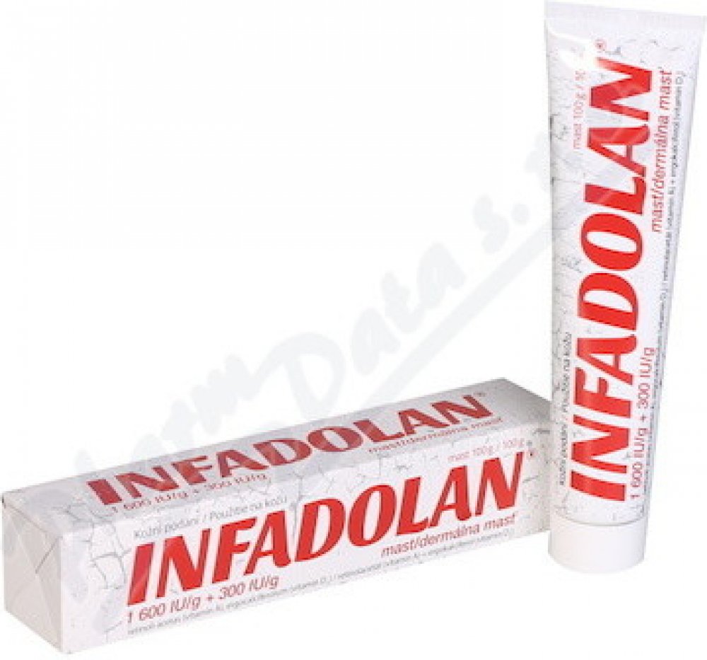 Účel přípravku: Infadolan je mast pro zevní použití obsahující vitamin A a vitamin D2 v bezvodém masťovém základu, vhodná k urychlení hojení a obnovy pokožky na postiženém místě.