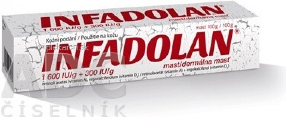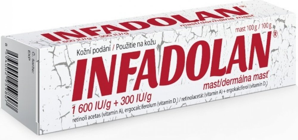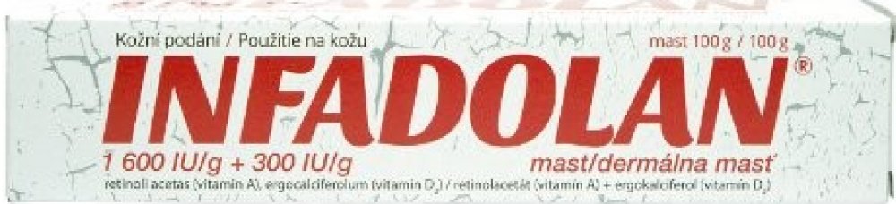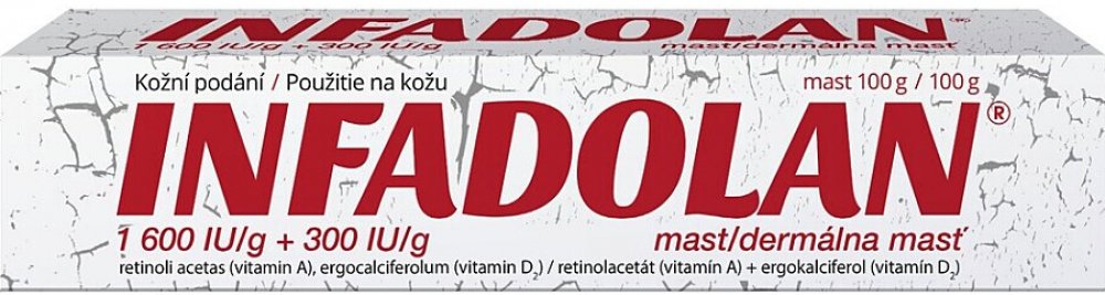 Infadolan je mast pro zevní použití obsahující vitamin A a vitamin D2 v bezvodém masťovém základu, vhodná k urychlení hojení a obnovy pokožky na post...