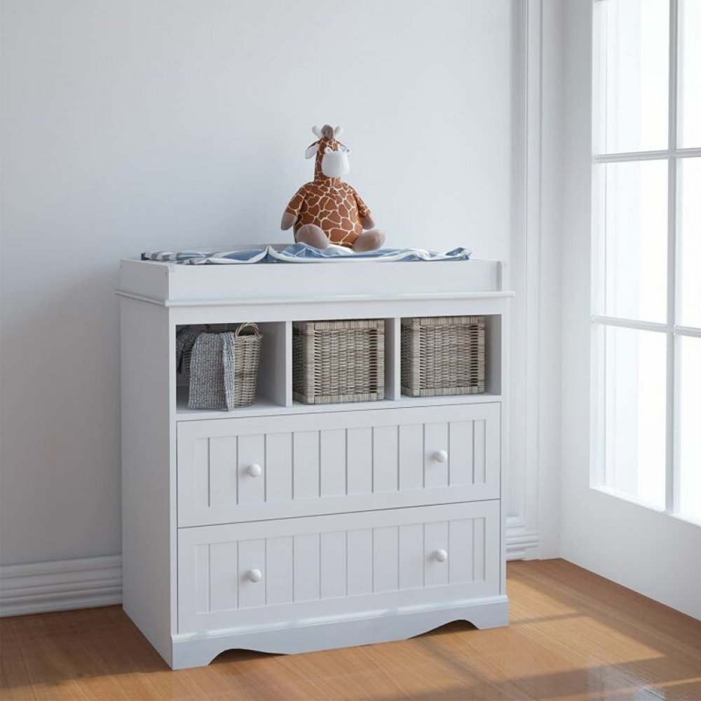 Ve dvou zásuvkách a třech přihrádkách je dostatek místa pro plenky, oblečení, a produktů pro každodenní péči o dětskou pokožku, které by měly být vždy po ruce při přebalování. Bílá barva se hodí do každého dětského pokoje a lze ji kombinovat s nejrůznějším nábytkem.