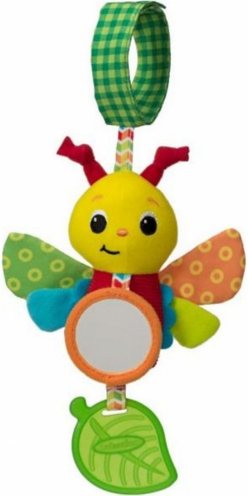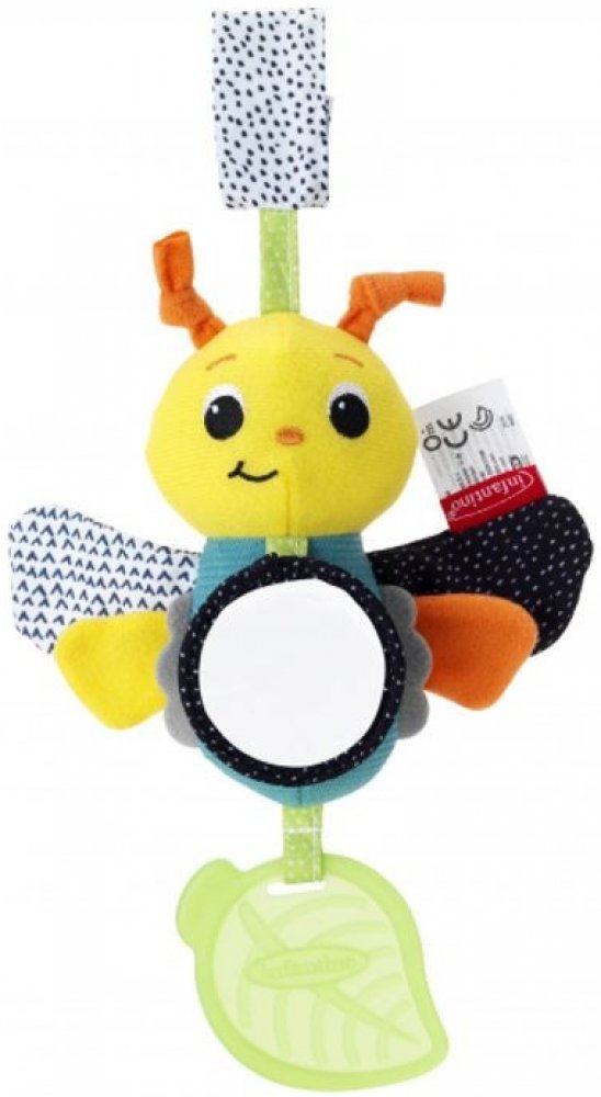 Tento veselý motýlek nabízí různorodé textury ke zkoumání, šusticí křídla, bezpečné zrcátko a kousátko, které pomáhá dítěti při prořezávání prvních zoubků. Při pohybu jemně cinká. Hračku je možné zavěsit na autosedačku,