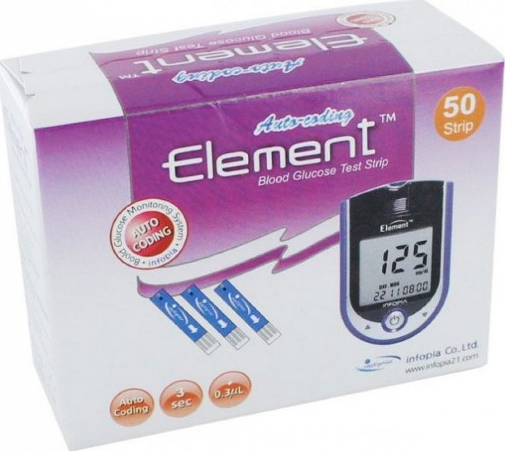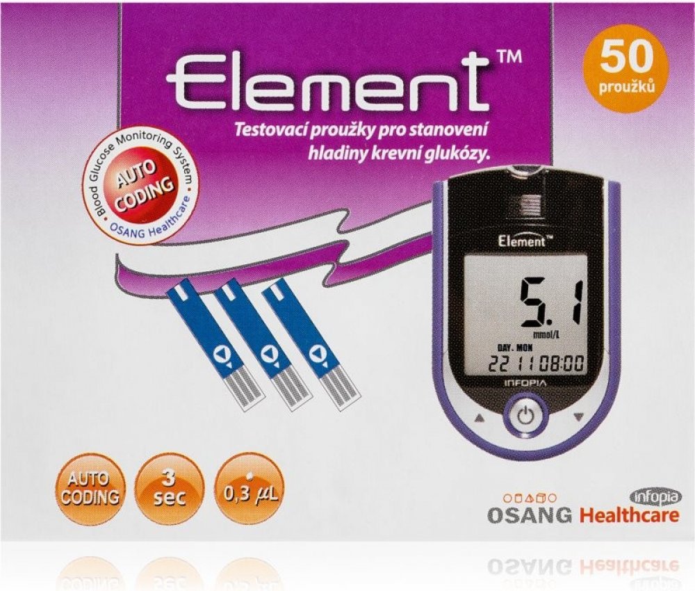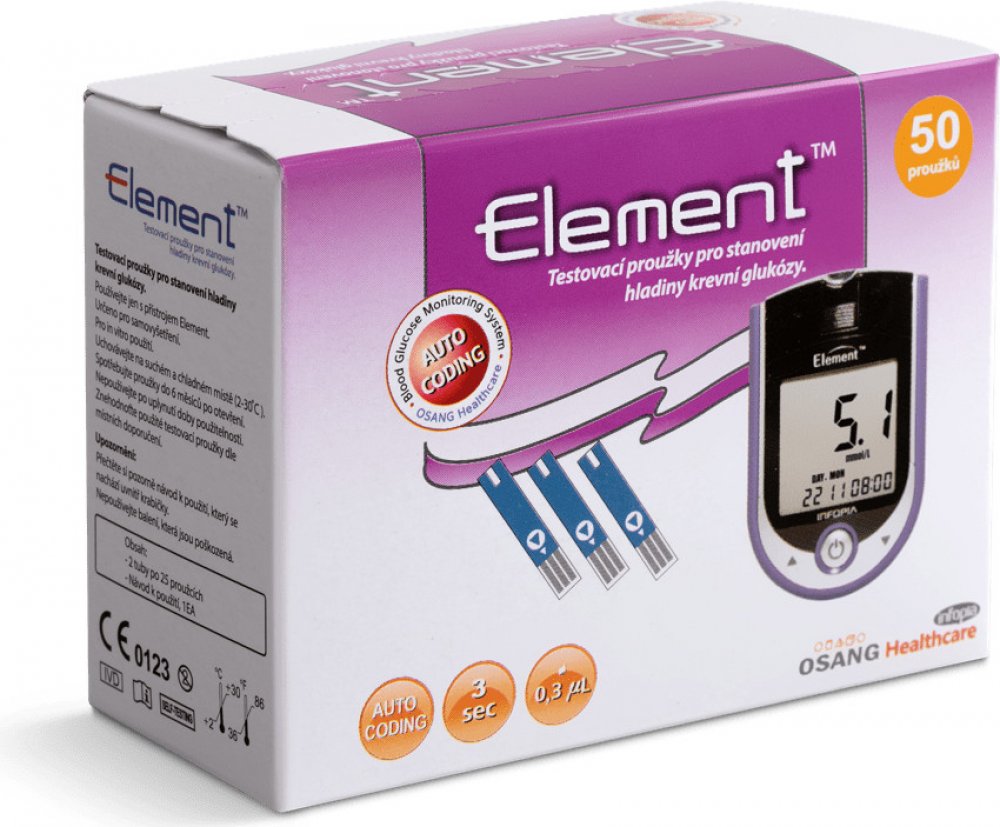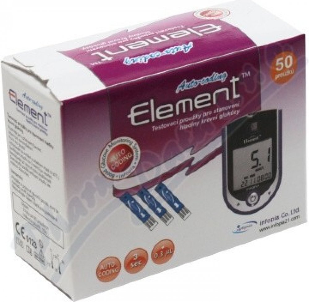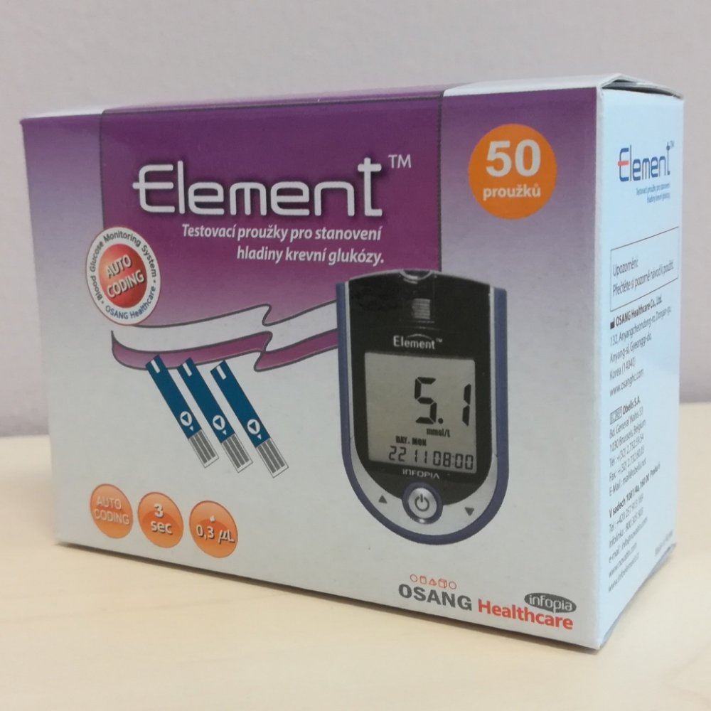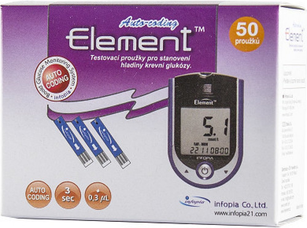 Diagnostické proužky Element jsou zdravotnický prostředek určený pouze k použití s glukometry Element pro měření hladiny krevní glukózy. Testovací proužky používají biosenzorovou technologii složenou z elektrochemických složek a vyžadující jen malé množství krve (0,3mikrolitru). Kromě vyšetření glykemie z konečků prstů ze vyšetření provést i ze hřbetu ruky, dlaně, paže, předloktí, lýtka a stehna. ...