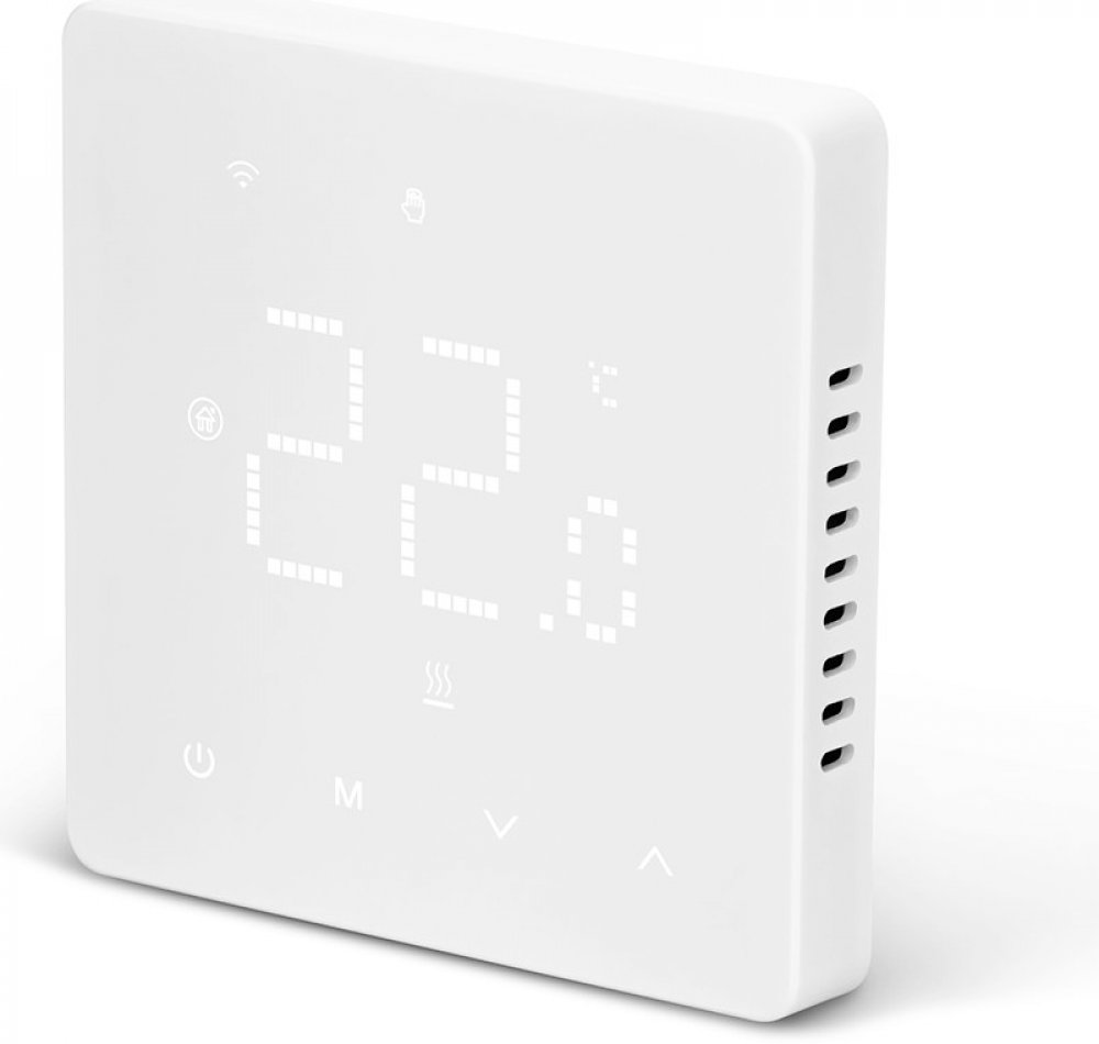Digitální pokojový WiFi termostat s týdenním programem. S interní i externím čidlem teploty. Možnost nastavení hlidání maximální teploty podlahy 25°C až 60°C.Vhodný k ovládání podlahového topení, přímotopů, topných kabelů, spínání relé elektrokotlů nebo plynových kotlů (spínané síťovém napětím 230V)Ovládání: na termostatu nebo pomocí aplikace TUYA přes Wi-Fi pomocí chytrého telefonu z jakéhokoliv místa, kde je dostupný internet.Bezplatná mobilní aplikace pro zařízení s iOS a Android ('Smart Life - Smart Living').Montáž přímo do elektroinstalační krabice pod omítku.