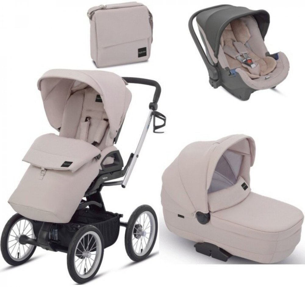 Inglesina Quad Systém se skládá ze sportovní sedačky, podvozku Quad XT, nákupního košíku, hluboké korbičky, autosedačky Huggy, držáku na lahve, nánožníku a pláštěnky na sportovní kočárek.