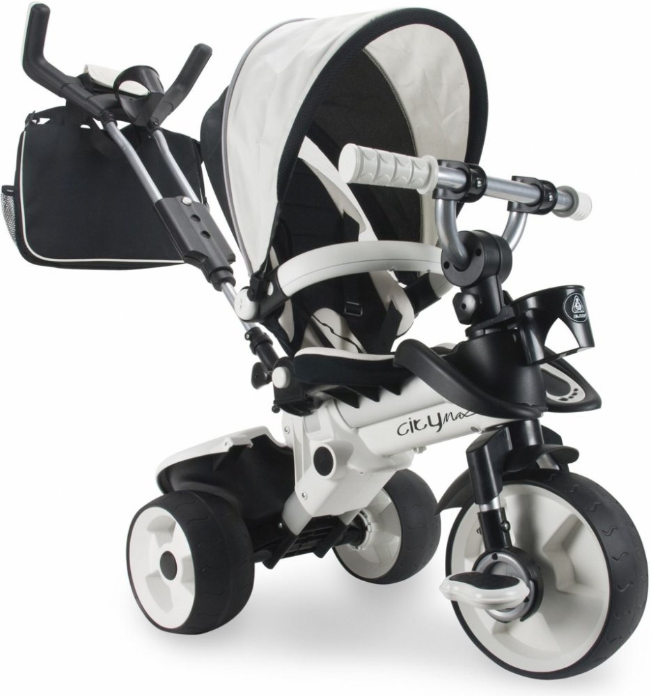 Dětská evoluční šlapací tříkolka s vodicí tyčí CITY MAX patří do nelicenční řady Innobaby, která je určena pro děti již od 6 měsíců. Naleznete v ní odrážedla, multifukční odrážedla, evoluční tříkolky a tříkolky. Moderní, designová, sportovně laděná evoluční tříkolka s kovovou konstrukcí a pogumovanými koly pro tichou jízdu, vypadající i jako sportovní kočárek, je díky vodicí tyči a ergonomicky tvarované podnožce pro nohy a dalším funkčním doplňkům, vhodná právě pro děti už od 6 měsíců. Tato tříkolka s dítětem doslova roste a přizpůsobuje se jeho vývojovým potřebám, což její největší výhodou. Z počátku dítě jezdí s nataženými nožičkami jako v kočárku, později je má položené na pedálech, ale díky vodicí tyči nemusí šlapat a může vnímat jen pohyb šlapacích pedálů a nakonec tříkolku plně obsluhuje samo. Veškeré doplňky se dají snadno montovat a demontovat.