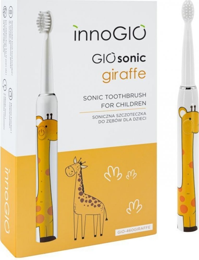 INNOGIO GIOSonic Giraffe Elektronický sonický zubní kartáček Kartáček je navržený tak, aby vyhovoval potřebám dětí, které se již samy dokážou postarat o své zuby. Je lehký a jeho jemná hlavice se dokonale přizpůsobí velikosti dětských zubů, takže čištění zubů je pro dítě pohodlné a efektivní. Barevné grafické ztvárnění zvířat přitáhne pozornost dětí a z čištění zubů udělá zábavu.