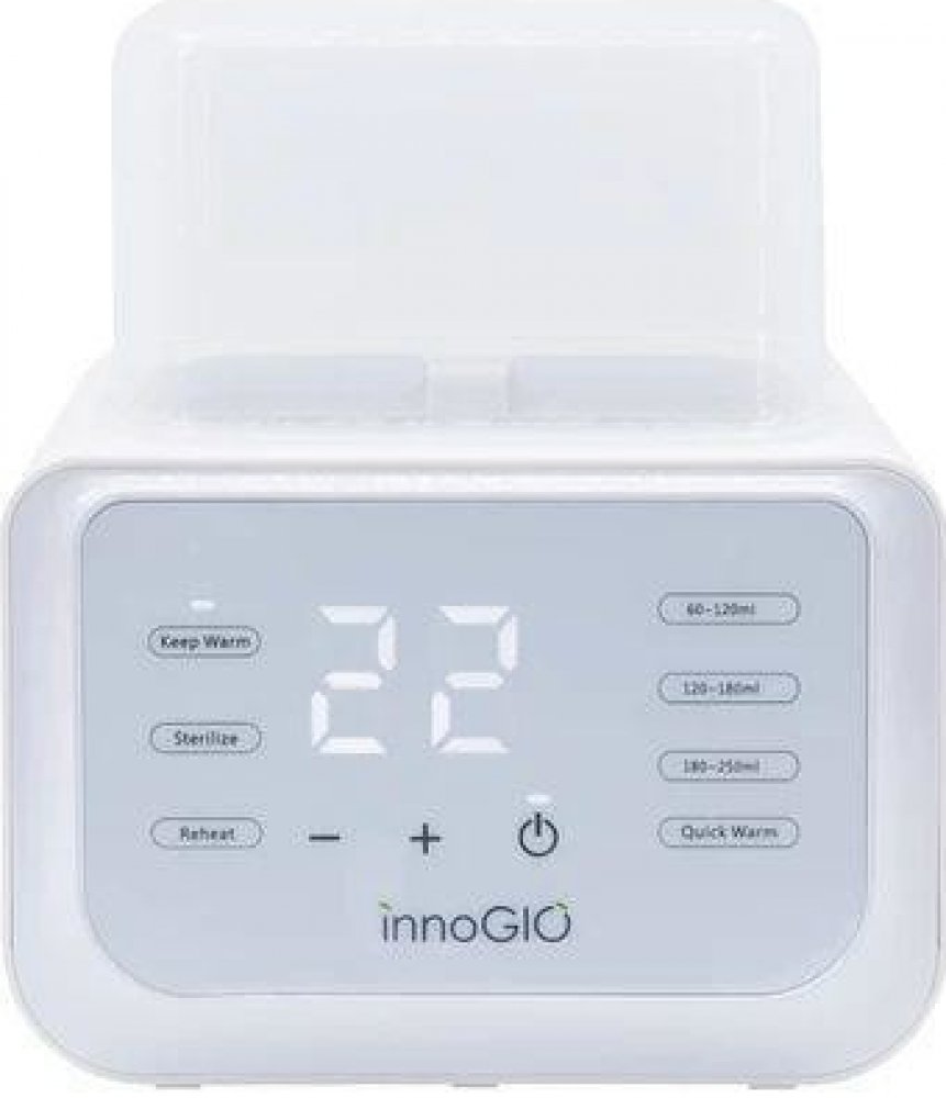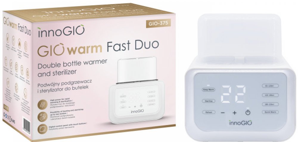 GIOwarm Fast Duo je dvojitý ohřívač lahví a sterilizátor v jednom! Je to vynikající přístroj, který rychle ohřeje porci mléka, pití nebo plnohodnotného jídla připraveného pro miminko na požadovanou teplotu a následně stejně rychle a bezpečně sterilizuje kojenecké lahve, aby byly kdykoliv připravené k použití.dvojitý digitální ohřívač a sterilizátor v jednompracuje v 5 režimech: rychlý ohřev / pomalý ohřev / udržování teploty / rozmrazování / sterilizacedvojitý koš umožňuje současně ohřívat, rozmrazovat nebo udržovat potraviny při konstantní teplotě ve dvou nezávislých lahvích, sklenicích nebo sáčcíchpřehledný, velký a digitální ovládací panel s dotykovými tlačítkydeska s nepřilnavým povrchem zajišťuje snadné čištěnívíko pro lepší udržení teplasystém ochrany proti přehřátíautomatické vypínání po dokončení sterilizaceakustický alarm oznamující konec činnostiteplotní rozsah: 37°C - 90°C v závislosti na použitém režimusnadné použitívelmi kompaktníneobsahuje BPAmoderní design, který se hodí do každého interiérunapájecí zdroj AC 220-240 V, 50/60 Hzpříkon: 250 Wrozměr: 20,5cm x 14cm x 22,5cmDůležité upozornění nebo bezpečnostní informace o tomto výrobku naleznete v návodu k použití (záložka "Ke stažení"). Před prvním použitím si prosím přečtěte návod k použití. Používejte podle návodu k použití. Výrobek sami nerozebírejte, ani s ním nemanipulujte jinak, než jak je uvedeno v návodu k použití. Výrobek pravidelně kontrolujte. Zjistíte-li jakékoliv poškození, přestaňte jej používat. Výrobek nevystavujte vysokým teplotám nebo vlhkosti. Nepoužívejte výrobek v blízkosti otevřeného ohně, nevystavujte jej přímému slunečnímu záření ani jiným zdrojům tepla.Innogio Sp. z o.o.Ostródzka street 74H03-289 Varšava, Polskotel: +48508311775email: innogio@innogio.com