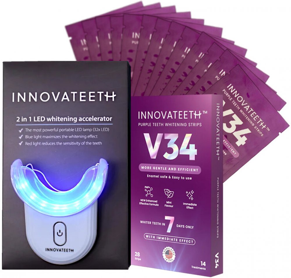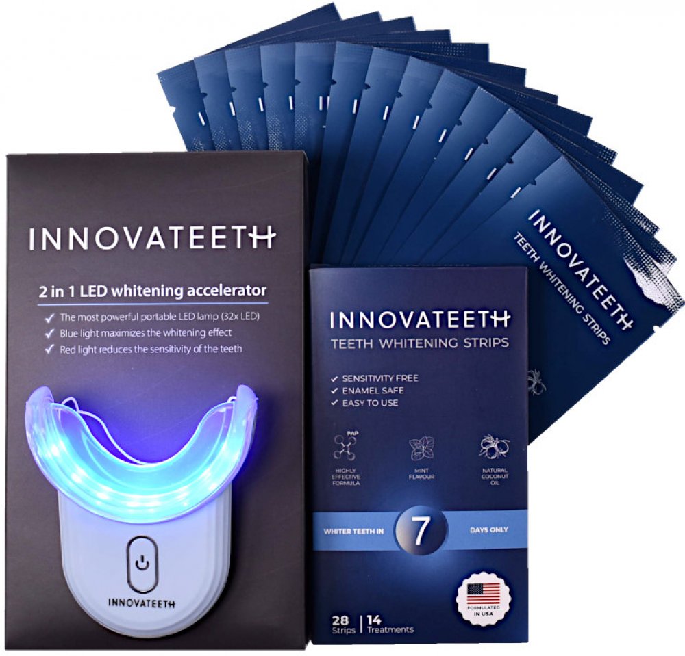 Unikátní balíček - kombinace 2 produktů od značky INNOVATEETH - Bělícího LED světla a 28 Bělících pásků!