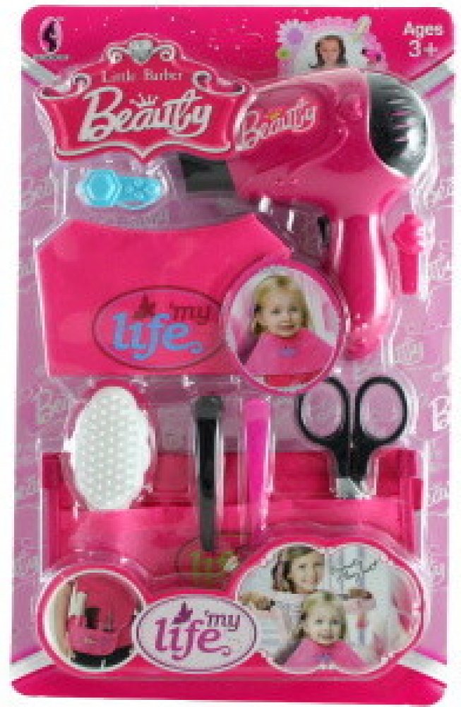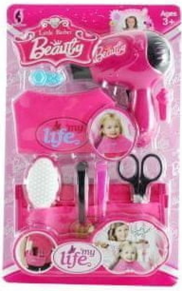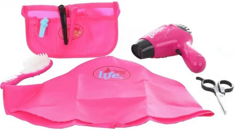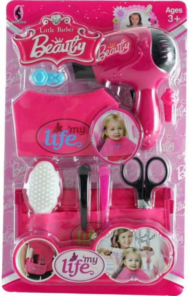 Kadeřnický set s fénem na baterie. Dále obsahuje roušku na střihání, sponky, skřipce, kartáč, nůžky, a kapsář. Rozměry balení cca 34 x 21 x 5 cm, fénu 12 x 13 cm. Napájení na 1x AA baterii (není součástí). Věk 3+