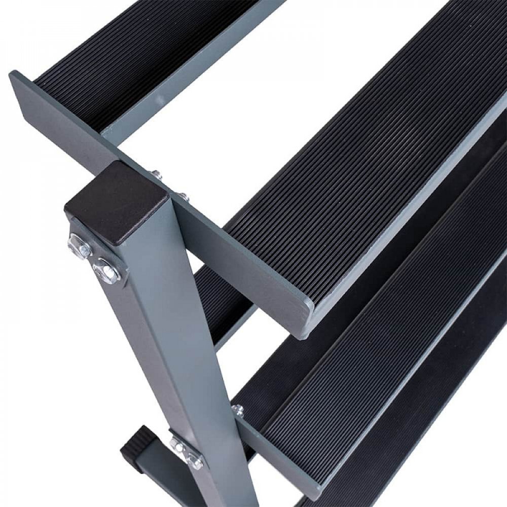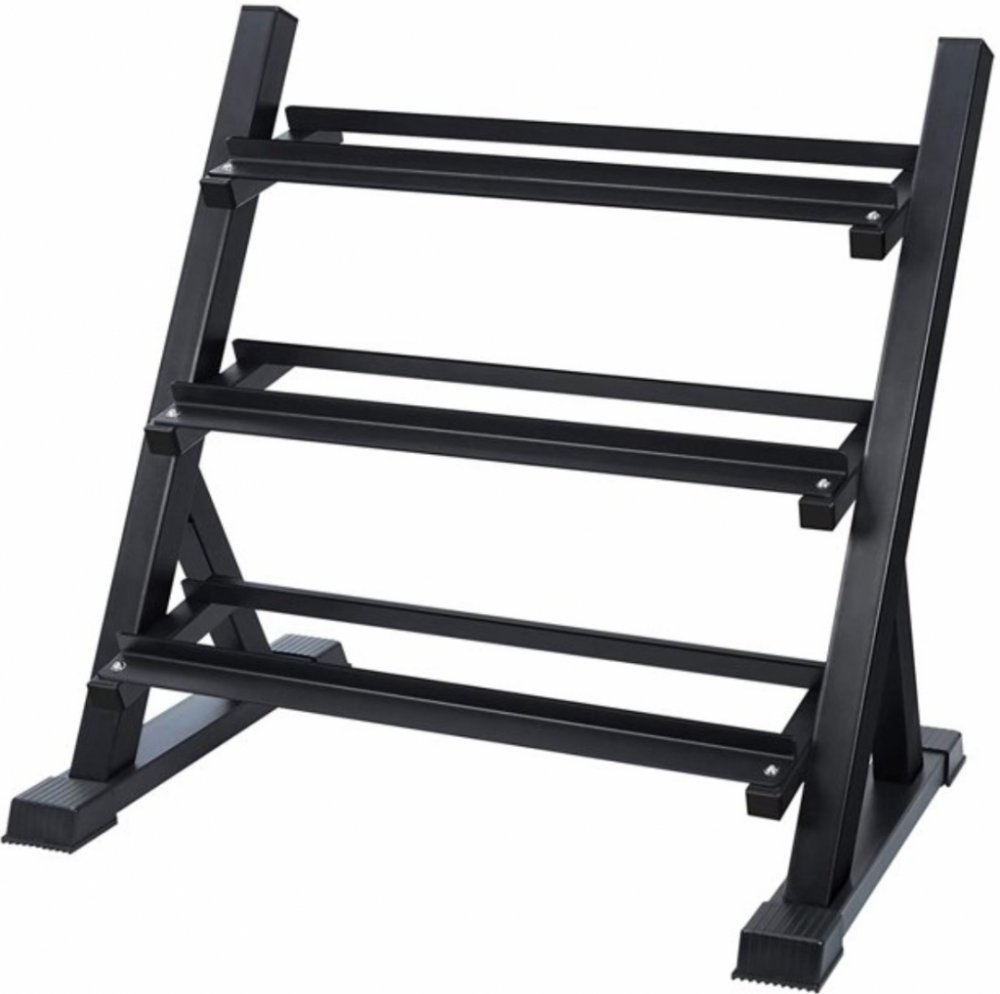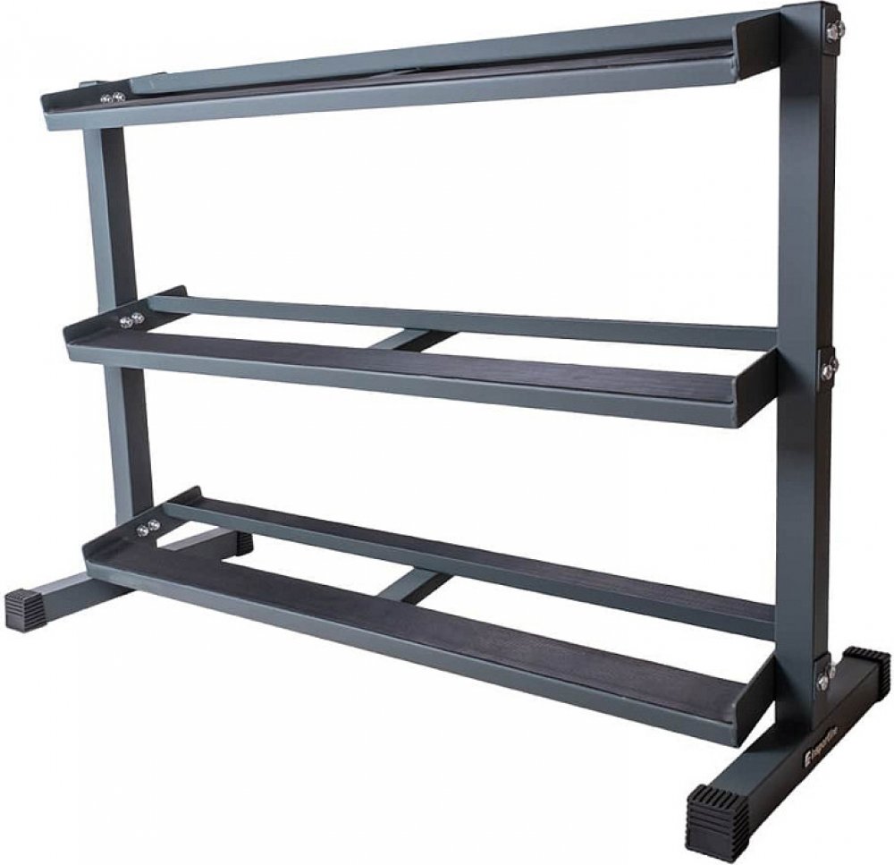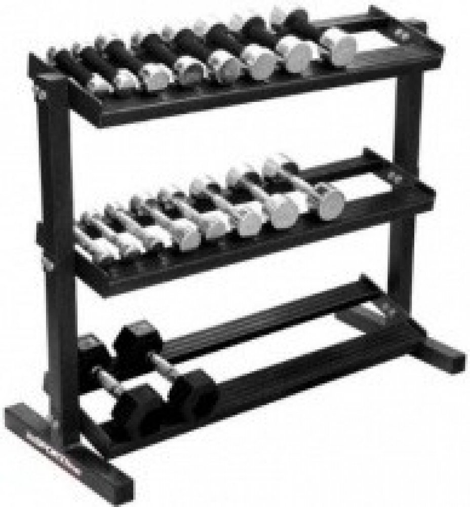 Policový stojan na šestihranné i klasické jednoručky, ze tří pater, s gumovou tlumící podložkou.