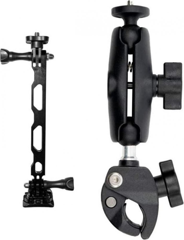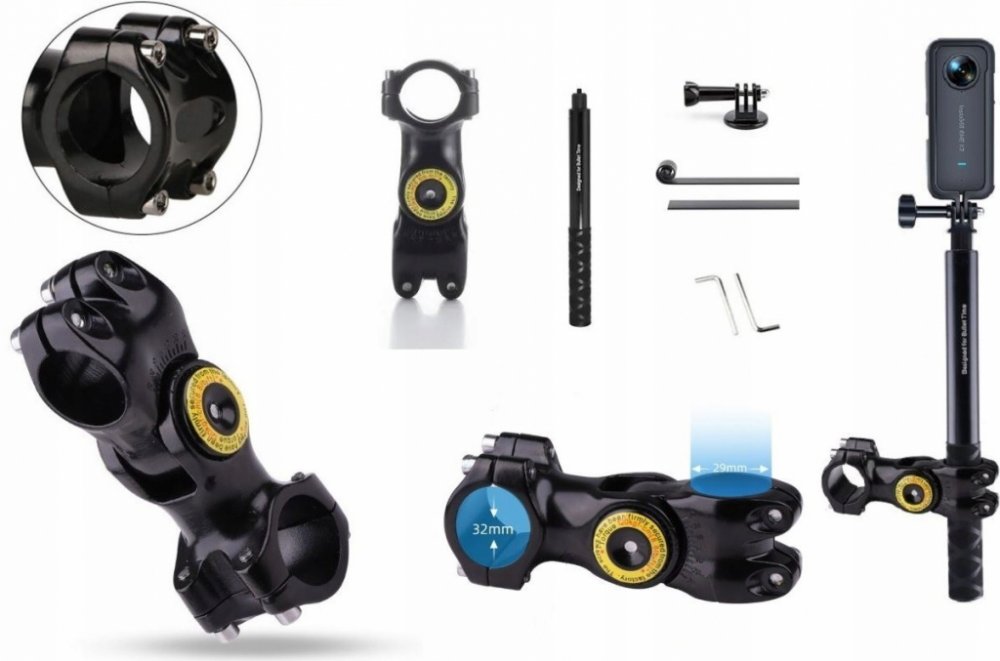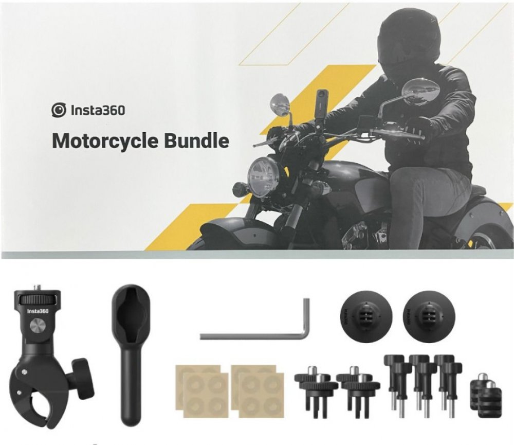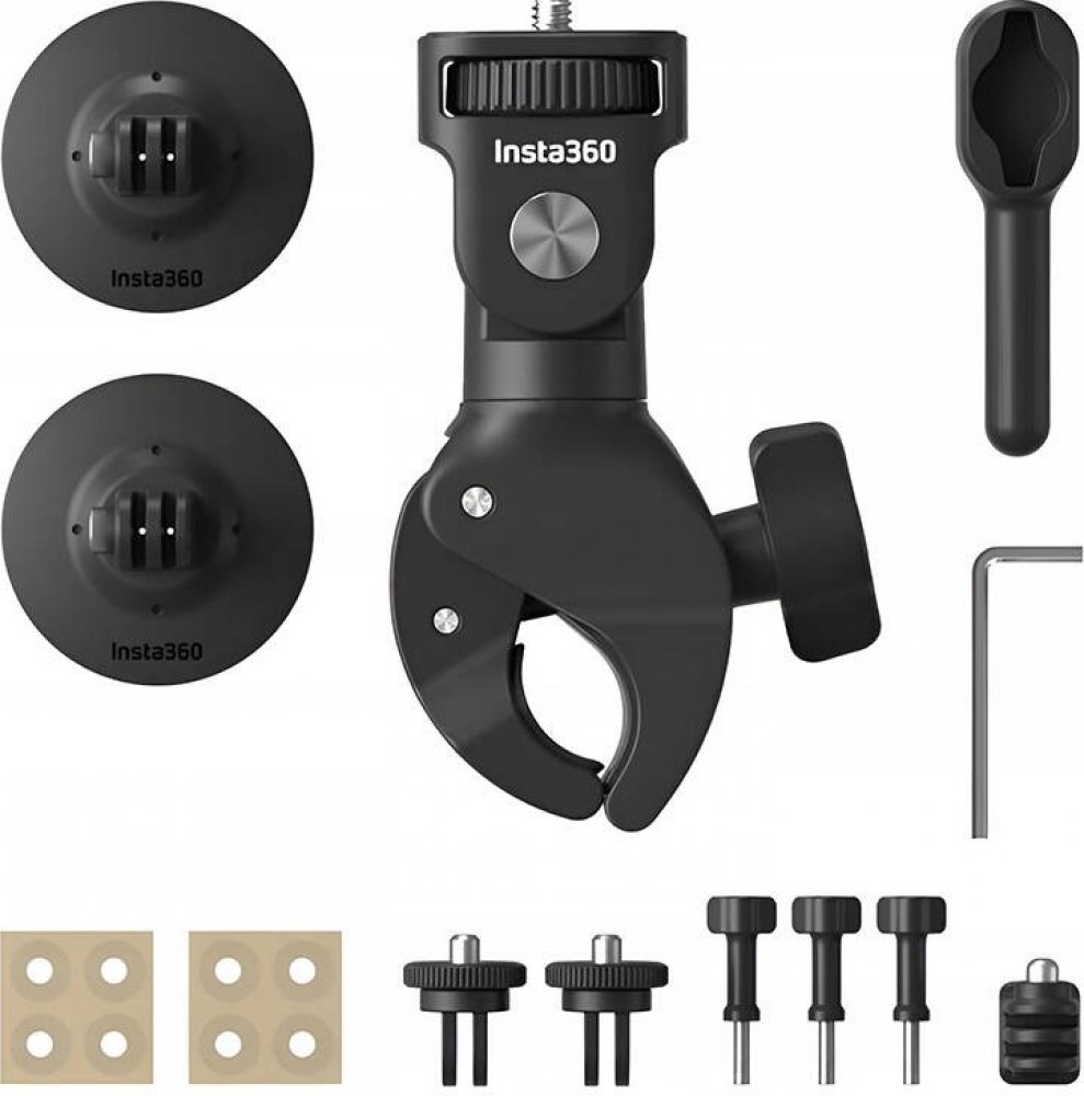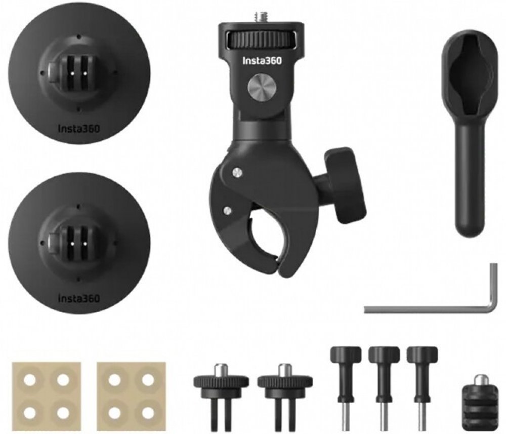 Montážní sada kamery na motorku Insta360. Obsahuje objímku na řidítka, dva samolepicí držáky na helmu, dva adaptéry se stativovým závitem, adaptér s vnitřním stativovým závitem, pojistné šrouby a plastové vložky. Součástí sady je i šestihranný klíč a utahovací nástroj.