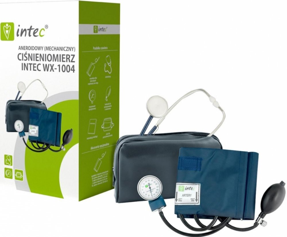 Aneroidní tlakoměr Intec WX-1004 je přístroj k měření krevního tlaku klasickou auskultační metodou poslechu Korotkovových ozvů při snižování tlaku v manžetě. Jedná se o cenově výhodný model.