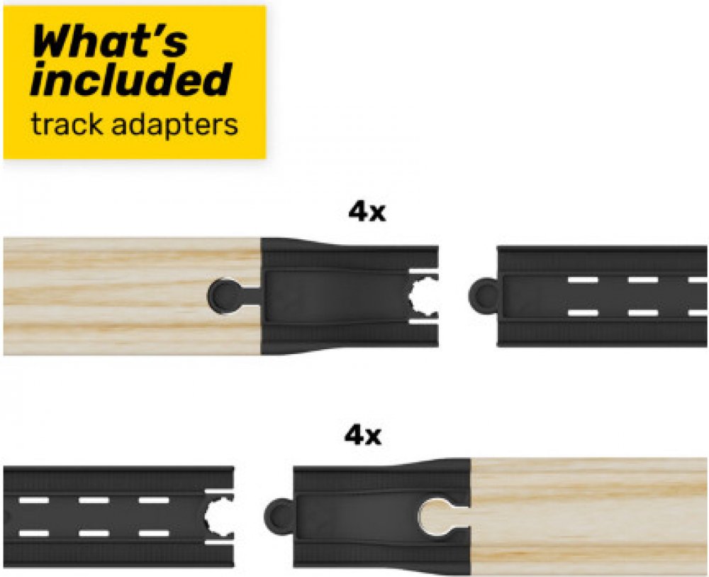 Sada univerzálních adaptérů na dřevěné koleje pro Intelino Smart Train. Můžete propojit Intelino dráhu s běžně dostupnými dřevěnými kolejnicemi (Ikea, Brio, Woody, apod.). V balení 2 varianty spojek po 4 kusech.
