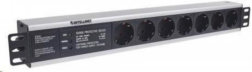 Intellinet 714006. Kapacita racku: 1.5U, Model: Jedna fáze, Základní materiál: Hliník. Počet zásuvek: 7 AC zásuvky / AC zásuvek, Typy zásuvky pro napájení ze sítě: Typ F. LED indikátory: Porucha, Výkon, Délka kabelu: 3 m. Nominální vstupní napětí: 250 V, Maximální proud: 16 A. Šířka: 44,4 mm, Hloubka: 482,6 mm, Výška: 62 mm