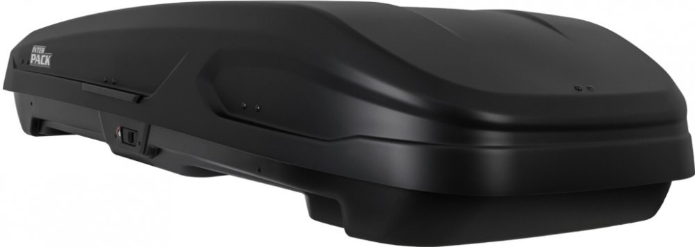 Střešní box Inter Pack Monsun PRO M 470L matně černý. Lehký (16 kg), odolný ABS, Smart Lock s rukojetí, rychlé uchycení a obousměrné otevírání. Vnitřní rozměry: 165 x 72 x 32 cm – ideální pro kufry, lyže a snowboardy do délky 165 cm.
