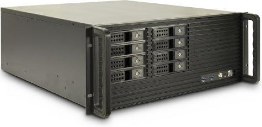 Skříň do racku, výška 4U, pro desky formátu Mini-ITX, mATX, ATX, E-ATX a SSI EEB; pozice: 2x 5,25" a 8x 3,5/2,5" hot-swap externí, 2x 2,5" interní; výška chladiče procesoru až 115 mm, délka grafických karet až 250 mm, 2x přední USB 3.2 Gen1 konektor; předinstalovaný 2x 80 mm ventilátor.