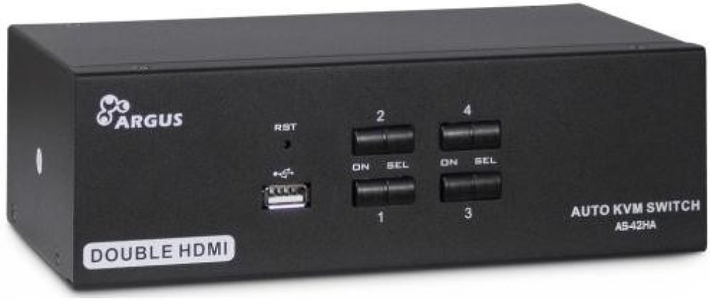 4portový KVM přepínač s HDMI rozhraním. V předním části je navíc přepínač vybaven USB portem pro připojení dalších zařízení jako USB flash disků, externích pevných disků apod.
