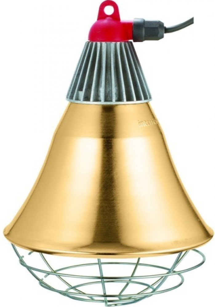 Infrazářič Interheat pro ohřev selat a drůbeže s chladičem patice žárovky. V drobném chovu může nahradit umělou kvočnu
