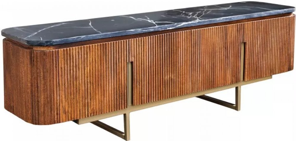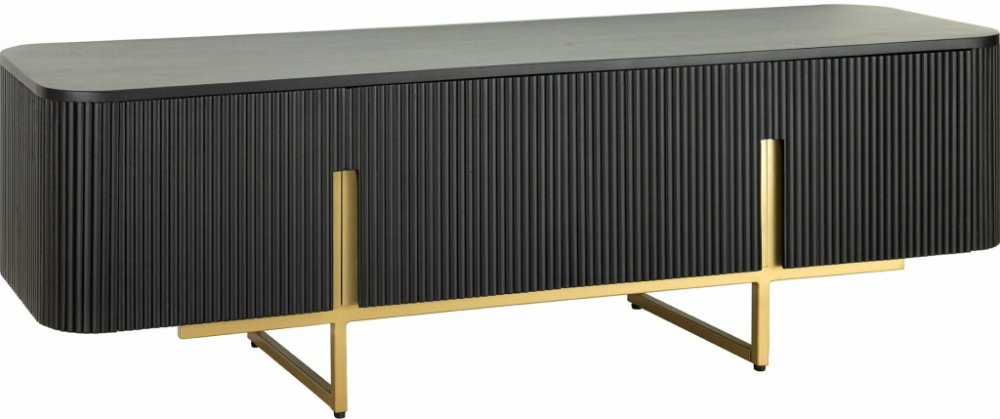 Televizní stolek GATSBY spojuje moderní eleganci s retro šarmem. Černý lakovaný korpus z masivního mangového dřeva s výraznou kresbou a kvalitním zpracováním zaujme zaoblenými boky a rýhovanými dvířky. Kovový rám ve zlaté barvě dodává designu luxusní akcent. Uvnitř se nachází čtyři prostorné přihrádky za dvěma dvířky, ideální pro uložení elektroniky, dekoračních předmětů či osobních věcí. Vhodné do obývacího pokoje, jídelny nebo pracovny.