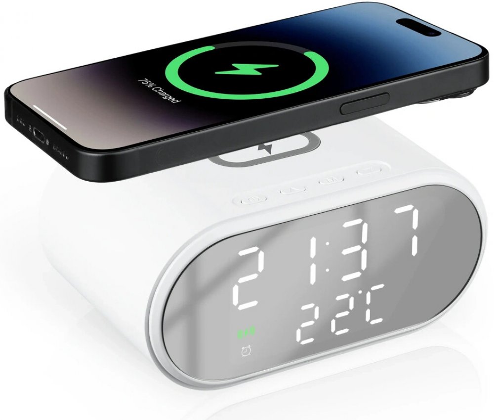 Objevte inovativní spojení funkčnosti a elegantního designu s budíkem, který nabízí rychlou bezdrátovou nabíječku Qi s výkonem 15W.Toto kompaktní zařízení je mnohem víc než jen hodiny – je to všestranné centrum na vašem nočním stolku, které se postará o včasné probuzení, nabije váš smartphone a zobrazí důležité informace, jako je aktuální teplota.Jeho minimalistický vzhled skvěle zapadne do každého interiéru, kde slouží jako praktický pomocník i stylová dekorace.Umožňuje rychlé bezdrátové nabíjení Qi s výkonem až 15W, kompatibilní s většinou smartphonů.Vybaven adaptivními režimy nabíjení: 5W, 7,5W, 10W a 15W pro optimální přizpůsobení vašemu zařízení.Nabízí až tři nezávislá nastavení alarmu pro spolehlivé a účinné probuzení.Zobrazuje aktuální čas (ve formátech 12/24H), datum a vnitřní teplotu (°C/°F).Má vícestupňové nastavení jasu LED displeje, s možností úplného vypnutí nebo aktivace režimu „zrcadlo“.Vyroben z kvalitního ABS materiálu, který zajišťuje odolnost a moderní vzhled.Kompaktní rozměry z něj dělají ideální doplněk na každý noční stolek, pracovní stůl nebo polici.Je skvělým tipem na dárek díky své multifunkčnosti a elegantnímu designu.Rychlé bezdrátové nabíjení a široká kompatibilitaZbavte se zamotaných kabelů na nočním stolku.Budík je vybaven pokročilou bezdrátovou nabíječkou Qi s výkonem až 15W, která vám umožní rychle a pohodlně nabíjet váš smartphone. Díky adaptivnímu výkonu se budík automaticky přizpůsobí požadavkům vašeho zařízení a zajistí optimální a bezpečné nabíjení. Stačí položit smartphone vodorovně na střed nabíječky a nabíjení začne automaticky, což potvrdí LED indikátor.Ideální řešení, abyste měli telefon vždy nabitý a připravený, když se ráno probudíte.Chytrý budík a přehledný displejBudík není jen přesný ukazatel času, ale i malé digitální informační centrum.Můžete si nastavit až tři nezávislé alarmy, což je ideální pro různé rozvrhy členů domácnosti a zaručí, že nikdo nezmešká důležitou událost nebo ranní vstávání.Velký LED displej ukazuje nejen čas (ve formátech 12/24H), ale také aktuální datum a teplotu v místnosti, kterou lze přepínat mezi stupni Celsia (°C) a Fahrenheita (°F).Jas displeje je plně nastavitelný – od nízkého po vysoký nebo i s možností úplného vypnutí, aby vás v noci nerušil.V úsporném režimu se obrazovka může proměnit ve zrcadlo a skvěle se tak hodí do designu ložnice.PoužitíTento multifunkční budík s nabíječkou je ideální do ložnice, kanceláře, obývacího pokoje nebo hotelového pokoje během cestování.V ložnici nahradí klasické hodiny i nabíječku a udrží pořádek na nočním stolku. Je praktický při nočním krmení nebo vstávání, poskytuje decentní světlo a rychlou kontrolu času.V kanceláři slouží jako elegantní doplněk na pracovní stůl, zároveň udrží váš telefon nabitý a na dosah. Skvěle se hodí také pro monitorování teploty v dětském pokoji a zajištění příjemného prostředí.Díky stylovému vzhledu je budík také skvělým dárkem pro blízké k jakékoliv příležitosti.Návod k použitíPřipojení a bezdrátové nabíjení:Připojte budík přiloženým USB kabelem ke zdroji napájení, USB nabíječce nebo USB portu v počítači (napájecí adaptér není součástí balení).Po připojení napájení se na budíku zobrazí aktuální čas.Položte smartphone podporující bezdrátové nabíjení Qi vodorovně na střed horní části budíku.Když se telefon začne nabíjet, LED indikátor na displeji budíku potvrdí aktivní nabíjení.Nastavení budíku (až 3 alarmy):Krátce stiskněte tlačítko "M" pro zobrazení možností alarmu: A1/A2/A3.Vyberte požadovaný alarm (A1, A2 nebo A3), poté dlouze stiskněte "M" pro vstup do nastavení hodin a minut alarmu. Použijte tlačítka "▽" a "△" pro nastavení hodnot.Když je na displeji zobrazen symbol A1, A2 nebo A3, krátce stiskněte "▽" nebo "△" pro zapnutí/vypnutí alarmu. Zapnutý alarm je indikován symbolem v levém dolním rohu obrazovky.Nastavení času a data:Nastavení času: Podržte tlačítko "M" pro vstup do nastavení formátu času (12/24H). Krátce stiskněte "▽" nebo "△" pro změnu formátu, poté krátce stiskněte "M" pro nastavení hodin a minut. Používejte "▽", "△" a "M" pro nastavení správného času.Nastavení data: Krátce stiskněte tlačítko "M", poté dlouze "M" pro vstup do nastavení data. Měňte rok, měsíc a den pomocí tlačítek "M", "▽" a "△".Zobrazení teploty:Dlouze stiskněte tlačítko "△" pro přepínání jednotek teploty mezi stupni Celsia (°C) a Fahrenheita (°F).Nastavení displeje a jasu:Nastavení displeje: Krátce stiskněte "△" pro vstup do nastavení zobrazení času/data:DP-1: Střídavé zobrazení času (10 s) a data (2 s).DP-2: Zobrazení pouze času.DP-3: Zachování aktuálního zobrazení. Krátce stiskněte "M" pro opuštění nastavení.Nastavení jasu: Krátce stiskněte "▽" pro vstup do nastavení jasu displeje:BΓ-1 až BΓ-4: Čtyři úrovně stálého jasu.BΓ-5: Režim zobrazení pouze na 5 sekund po aktivaci, poté zhasnutí.SpecifikaceVýkon bezdrátového nabíjení: 5W / 7,5W / 10W / 15W (adaptivní)Vstupní výkon: Max. 18 W (9V/2A)Účinnost nabíjení: 75-85 %Kompatibilita nabíjení: Smartphony s podporou bezdrátového nabíjení QiPočet skupin alarmů: 3Displej: LEDFunkce displeje: Čas (12/24H), datum, teplota (°C/°F)Nastavení jasu displeje: Víceúrovňové (od nízké po vysokou, možnost vypnutí/režimu zrcadlo)Materiál produktu: ABS, elektronické komponentyRozměry: 11 x 6,5 x 7,8 cmPracovní vzdálenost nabíjení: < 8 mmNapájení: USB kabel (součástí balení), vyžaduje USB adaptér (není součástí balení)Barva pro