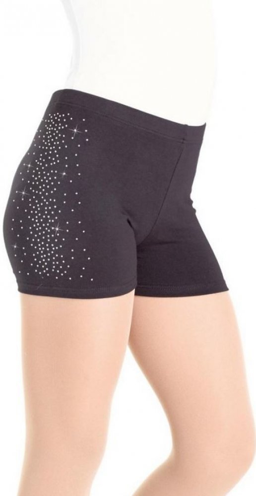 Kraťásky zdobené v boční partii drobnými dekorativními kamínky. Podélný pruh světlo odrazivých kamínků od pasu až k okraji nohavičky, ve středu pruhu hustější osázení, zdobná aplikace je jen na pravé staně. Zvýšený pas, super délka nohaviček. Pružné, příjemné na těle. Skvěle sedí. Snadno udržovatelné. Ideální kraťásky pro různá vystoupení, soutěže. Vzhledem ke skvělé materiálové skladbě vhodné i pro běžné využití v hodinách tance, event. při různých volnočasových aktivitách.