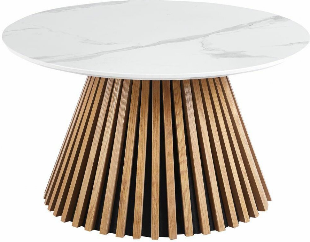 Konferenční stolek Kyoto okrouhlý 80 cm bílý mramor dub Intesi je moderní stolek, který spojuje atraktivní vzhled s praktičností. Jeho lehký, univerzální design a snadná údržba zajistí, že se hodí do každého obývacího pokoje. Všimněte si spojení nadčasového designu s praktickými detaily – výběrem tohoto dřevěného konferenčního stolku s kulatou deskou získáte nábytek, který vám bude sloužit dlouhá léta a stane se ozdobou vašeho domova.
