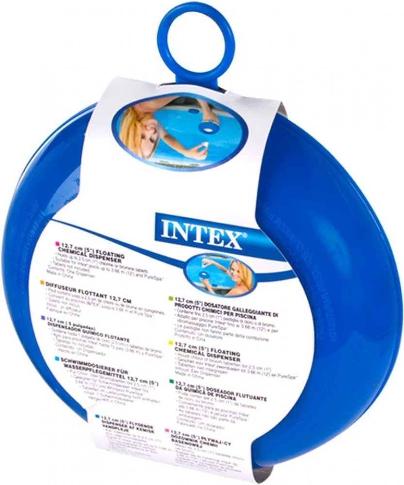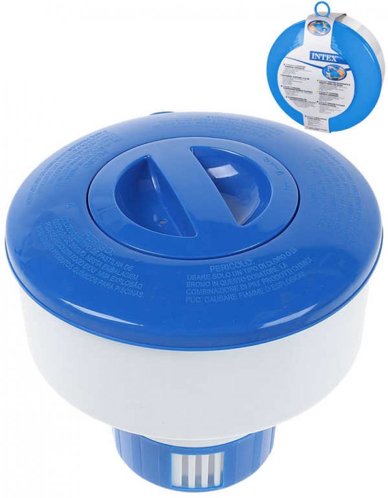 Potom je plovoucí dávkovač chemie značky INTEX tím pravým řešením pro vás! Tento modrý dávkovač, vyrobený z odolného polypropylenu, vám pomůže efektivně eliminovat nečistoty a bakterie, což přispěje k maximálnímu potěšení při každé koupeli. Stačí umístit tabletu chlóru pod víčko a nechat dávkovač vykonávat svou práci...