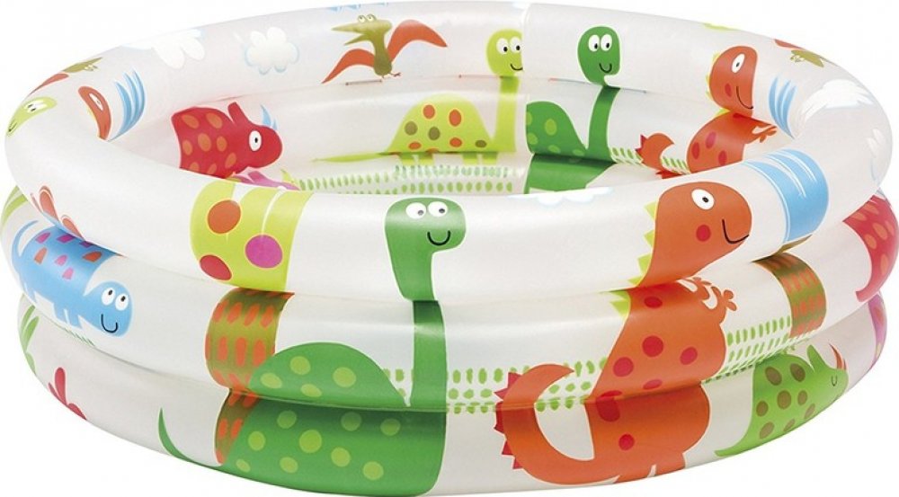 INTEX 57106 - Tří kruhový bílý bazének s potiskem, pro miminka a malé děti, v designu malých dinosaurů. Kapacita vody do 14 cm výšky stěny. Opravná sada přiložena.