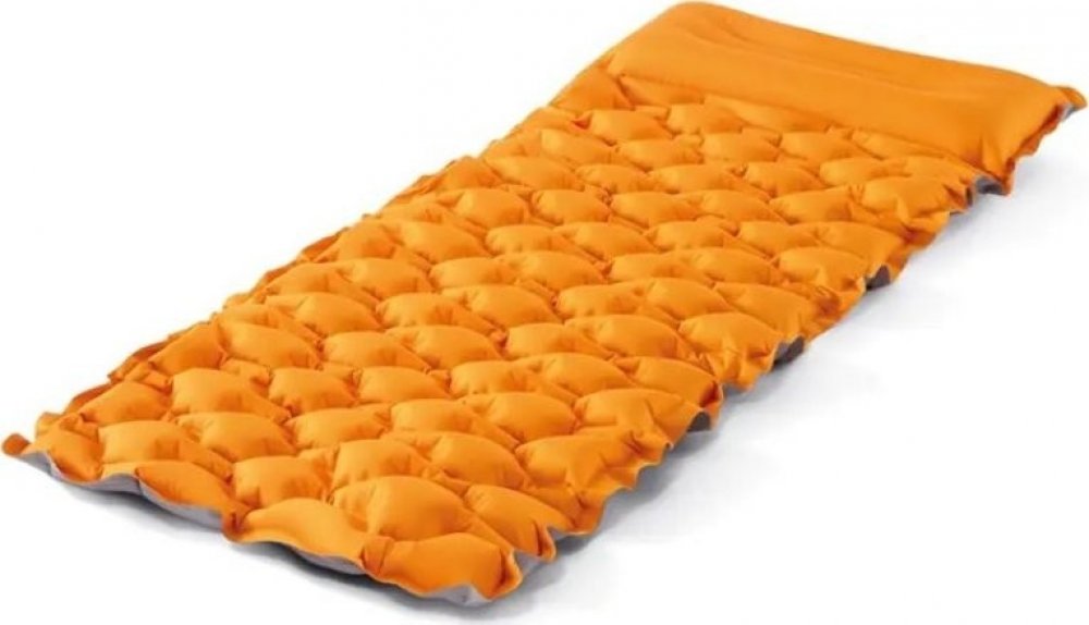 Nafukovací kempinková matrace v oranžové barvě ideální pro pobyt v přírodě.
