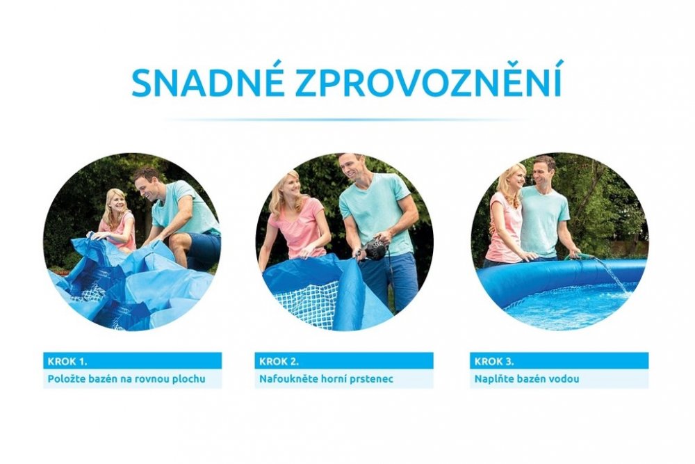 Pro osvěžení v horkých dnech se zaručeným faktorem pobavení pro celou rodinu, to vše nabízí bazén Easy Set velikosti O 183 x 51 cm od světového výrobce firmy INTEX. Objem vody při naplnění 80% 886 l, čas montáže ca. 15 minut. Tloušťka folie podlahy 0,25 mm, stěny 0,44 mm a prstence 0,27 mm se postarají o vysokou stabilitu a jistotu. Pro optimální filtraci doporucujeme INTEX filtrace typu ECO. Tyto filtrace jsou nejen vhodné z hlediska výkonu, ale také obsahují příslušné koncovky, které jsou k bazénu vhodné.