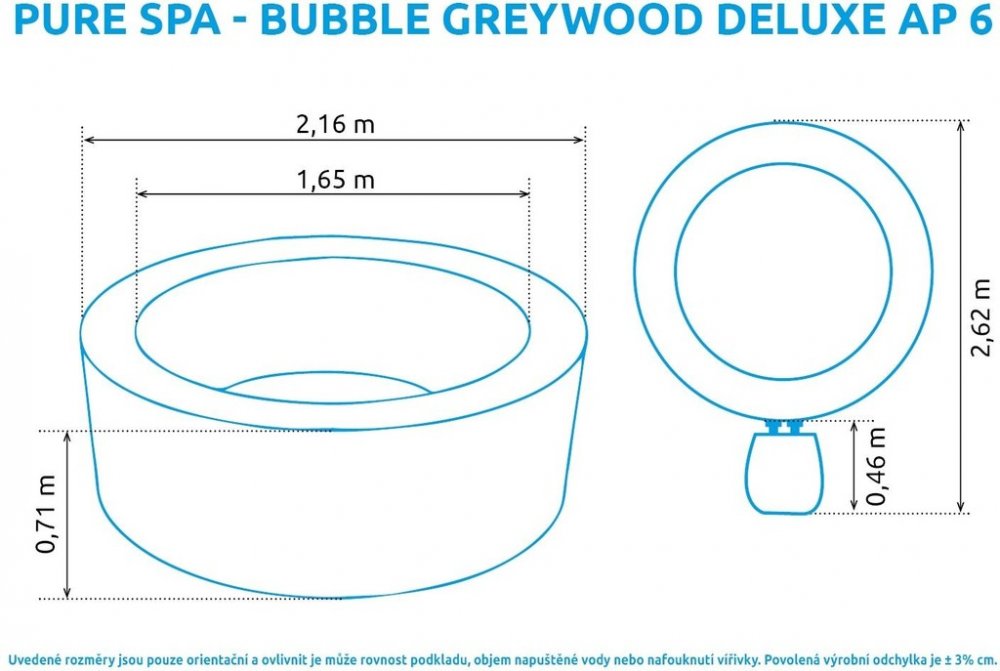 Vířivý bazén Pure Spa - Bubble Greywood Deluxe AP 6 disponuje novou funkcí WIFI pro spárování a ovládání vířivky pomocí mobilního telefonu. Dalším benefitem je systémem HWT na změkčování vody poskytuje dokonalou relaxaci. Díky jejím rozměrům je vhodná až pro šest osob. Vířivka má 170 vysoce výkonných bublinkových trysek, které masáží povzbudí každý sval. Vana je vyrobena z vysoce kvalitního 3 vrstvého PVC. Disponuje konstrukcí 54 FIBER-TECH BEAMS (silná polyesterová vlákna).