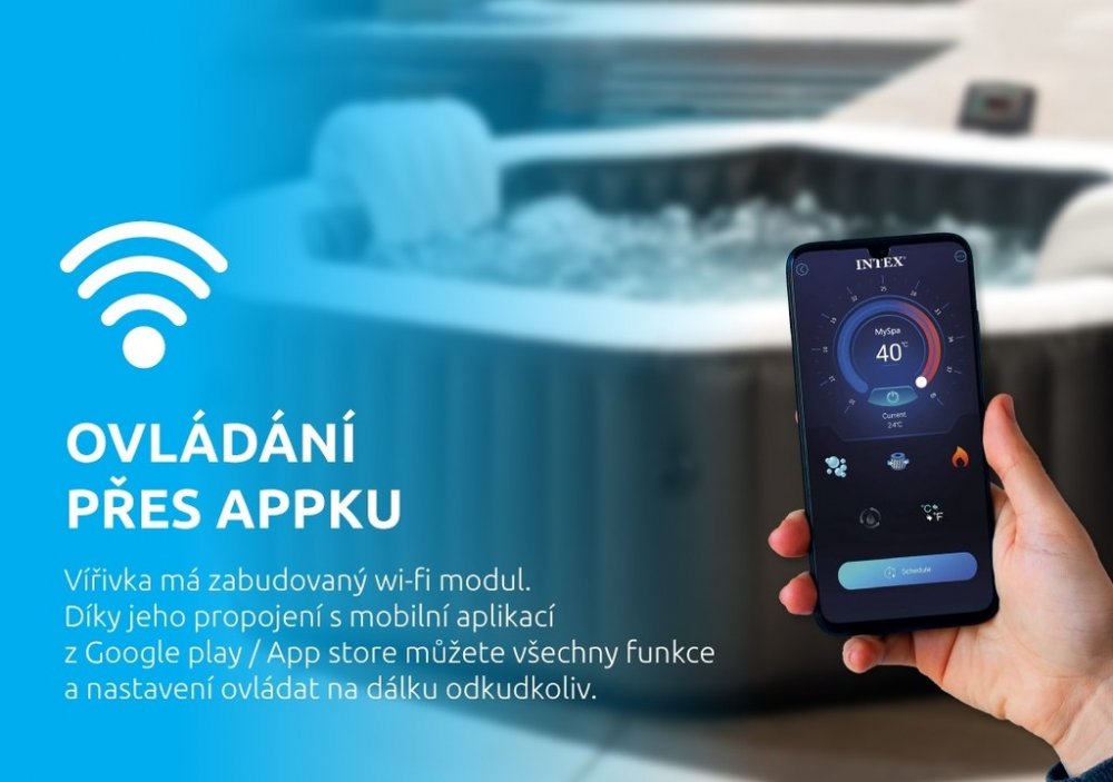 Teď pomocí telefonu můžeš zapnout režim masáže, ovládat teplotu vody nebo zapnout činnost filtračního čerpadla!