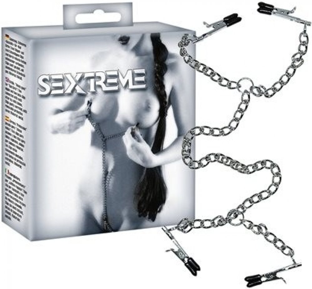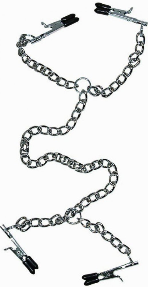 Kovové skřipce na bradavky spojené řetězem se skřipcem na stydké pysky. Tyto skřipce jsou potažené černou pryží, která předchází možnému zranění.