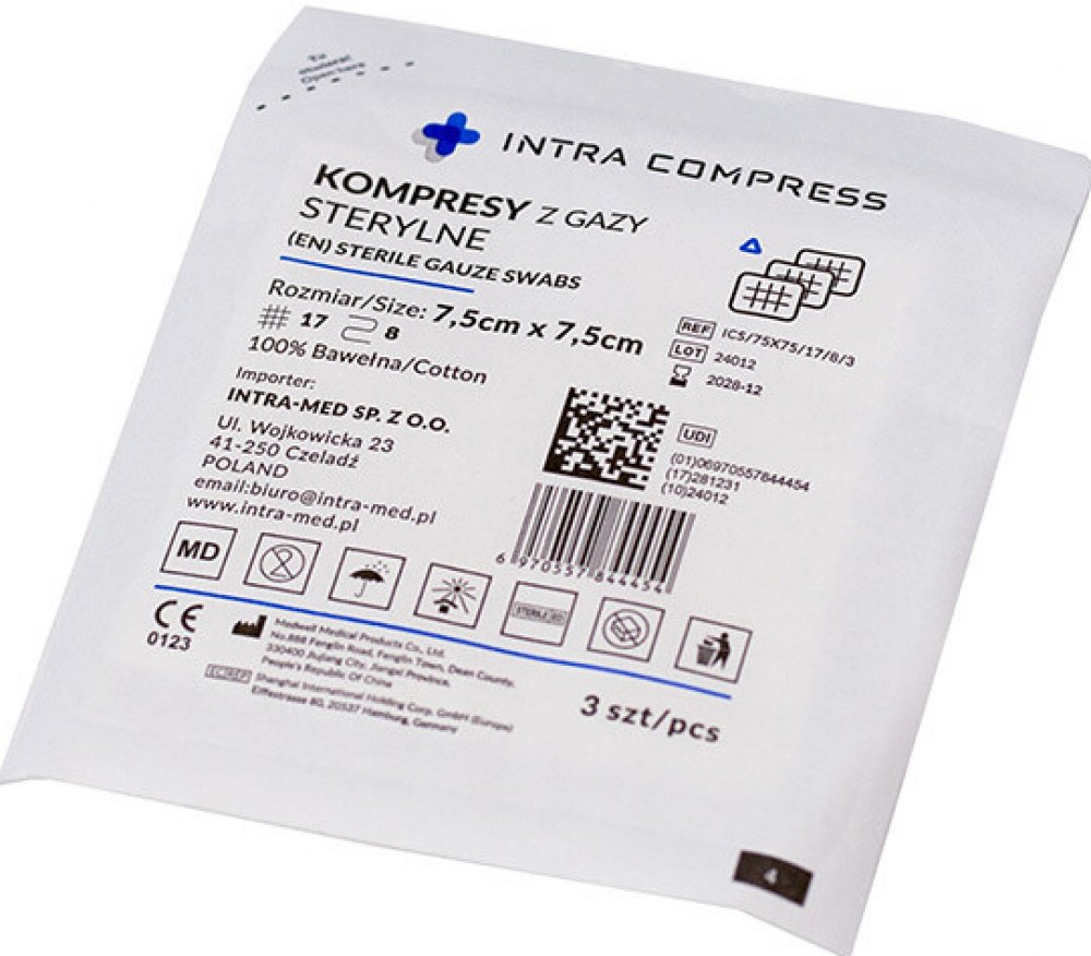 Sterilní kompresy Intra Compress jsou vyrobeny z nejkvalitnější bavlny, což zaručuje jemnost a vysokou savost. Kompresy jsou baleny po 3 ks v blistru a sada obsahuje 10 blistrů! Kompresy o rozměrech 7,5x7,5 cm jsou ideální pro obvazování a ochranu ran, poskytují ochranu před kontaminací a bakteriemi. Navíc jsou kompresy sterilizovány párou nebo ethylenoxidem, což z nich činí produkt pro profesionály!