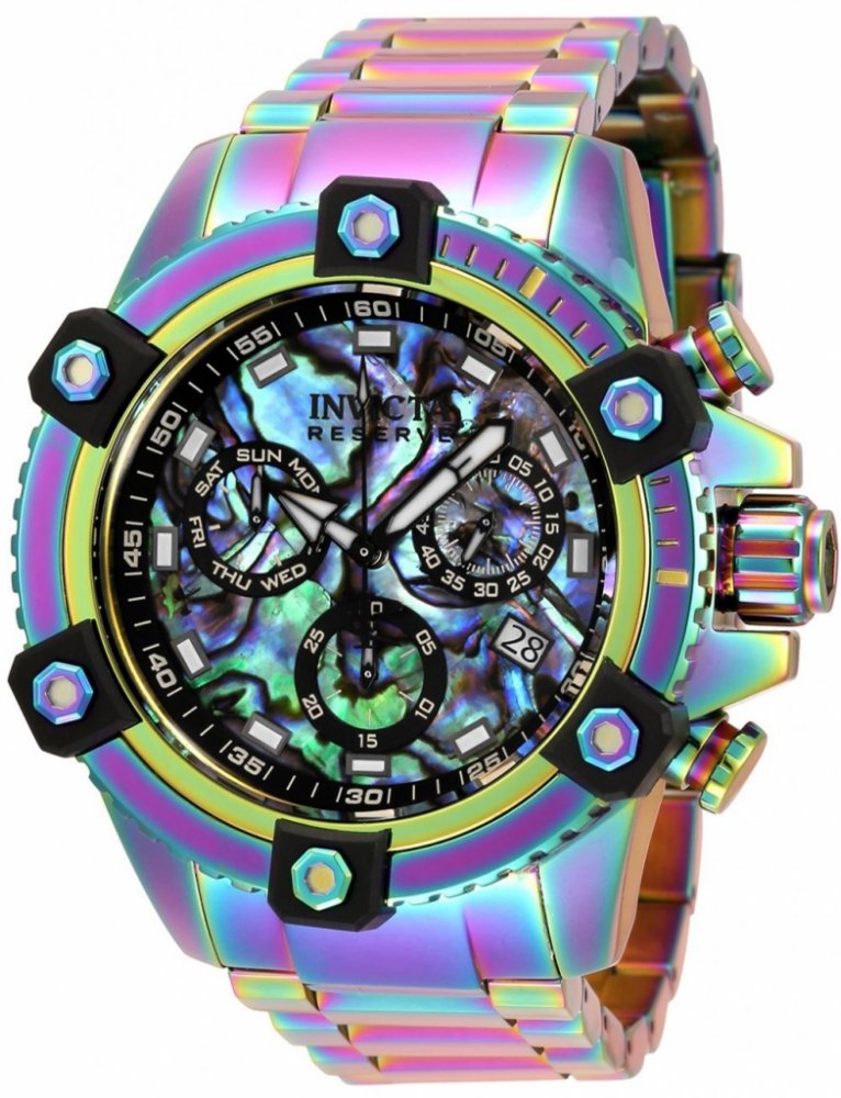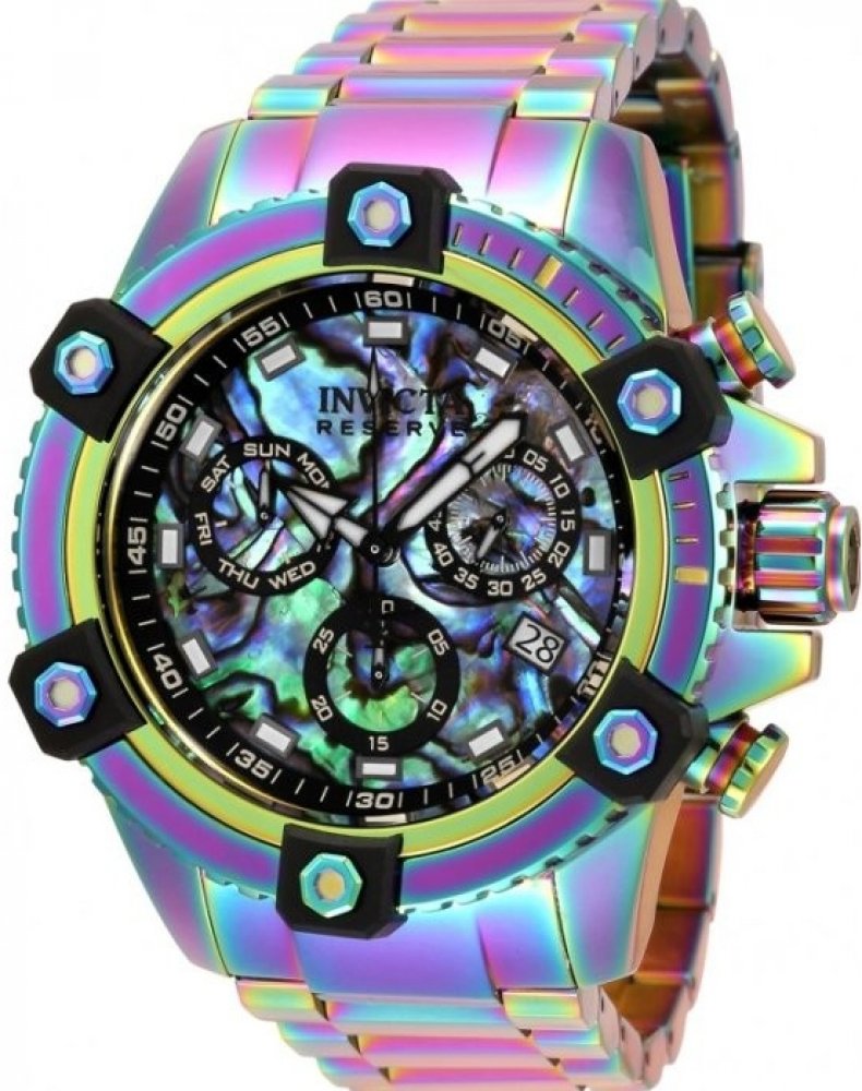 Hondinky Invicta 35555 mají 48mm pouzdro z Nerezová ocel s vícebarevným ciferníkem. Tento model je poháněn přesným strojkem Quartzové. Vodotěsnost 10 barů. Tento model je součástí kolekce Invicta Reserve. Zahrnuje 2 letou Invicta-záruku.