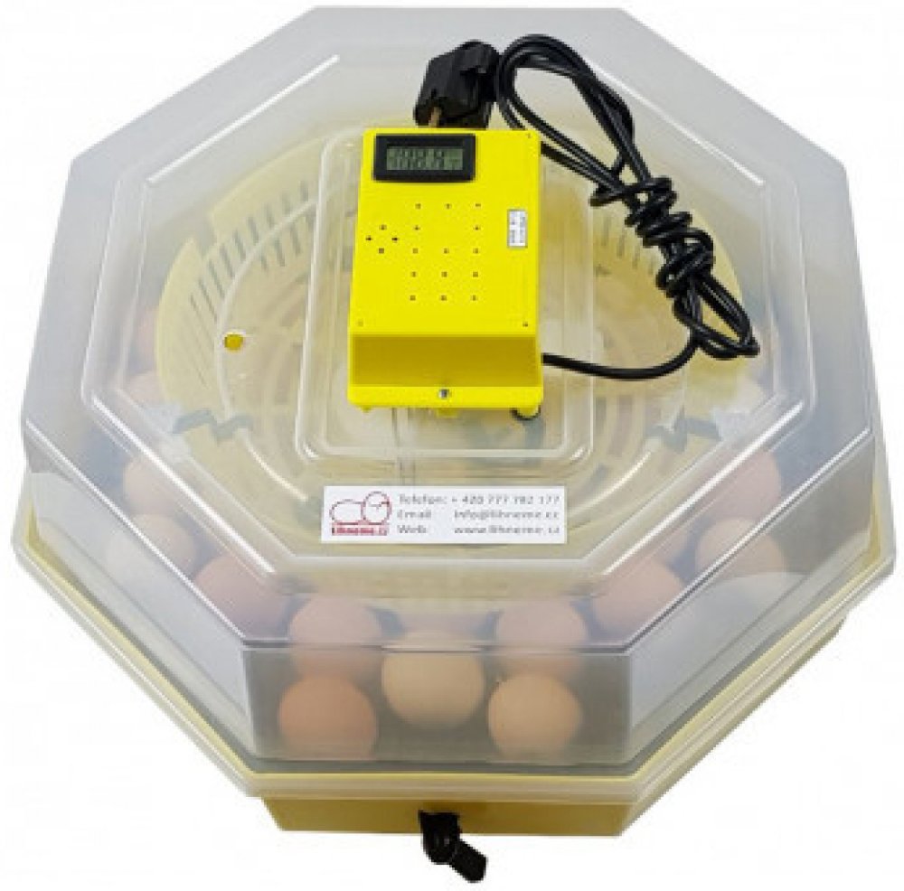 Líheň na vejce vhodná k líhnutí vodní a hrabavé drůbeže - pro kuřata, křepelky, kachny, krůty, husy a bažanty. S poloautomatickým otáčením až 41ks slepičích vajec - možnost i ručního otáčení vajec, s regulací teploty od 35 do 40°C, s manuální regulací vlhkosti, s teploměrem a s vlhkoměrem.