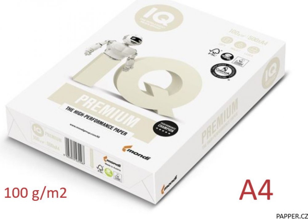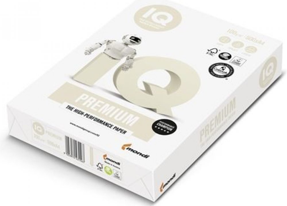 Kancelářský papír IQ Premium, doporučený do náročných podmínek s požadavkem na rychlost tiskuVyužívá unikátní technologií Triotec - výroba papíru ve třech vrstvách v sendvičové konstrukci, což zaručuje vysokou tuhost a tloušťku a tím vysokou stabilitu archů při tisku a kopírováníVhodný pro jednostranný i oboustranný tisk, inkoustové a laserové tiskárny a kopírkyVysoká bělost, CIE 1704 balíky v kartonuVýrobek zpracován bez použití chloruFSC certifikace