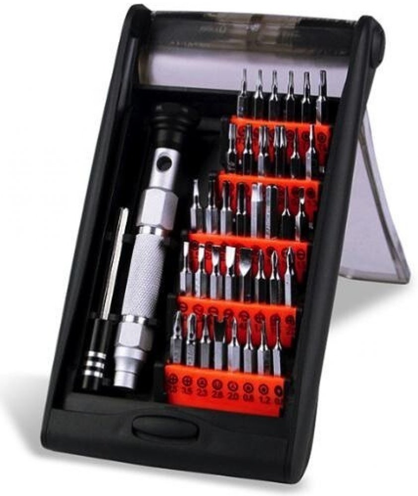 Universální sada nářadí 38v1 - na opravu RC modelůRukojeť šroubováku je vyrobena převážně z hliníkové slitiny, je odolná a lehká. Automatický výklopný design umožňuje snadné vyjmutí nástavců a pohodlné přenášení. Vhodné pro notebooky, chytré telefony a tablety. Různé typy bitů šroubováků splňují různé požadavky. Bity jsou vyrobeny z materiálu 6150 CR-V, po kalení a s lesklým chromovým povrchem, což zajišťuje jejich odolnost a spolehlivost.Balení obsahuje:36× sada bitů CR-VTorx: T3, T4, T5, T6, T7, T8, T9, T10, T15, T20Imbus (Hex): H0.9, H1.3, H1.5, H2.0, H2.5, H3.0, H3.5, H4.0Plochý: 1.0, 1.5, 2.0, 2.5, 3.0, 3.5, 4.0Křížový (Phillips): 1.0, 1.5, 2.0, 2.5, 3.5Trojúhelník: 2.3Tvar Y: Y2.0Pěticípá hvězda: 0.8, 1.2Tvar U: U2.6Bodový: 0.81× rukojeť z hliníkové slitiny1× prodlužovací nástavec