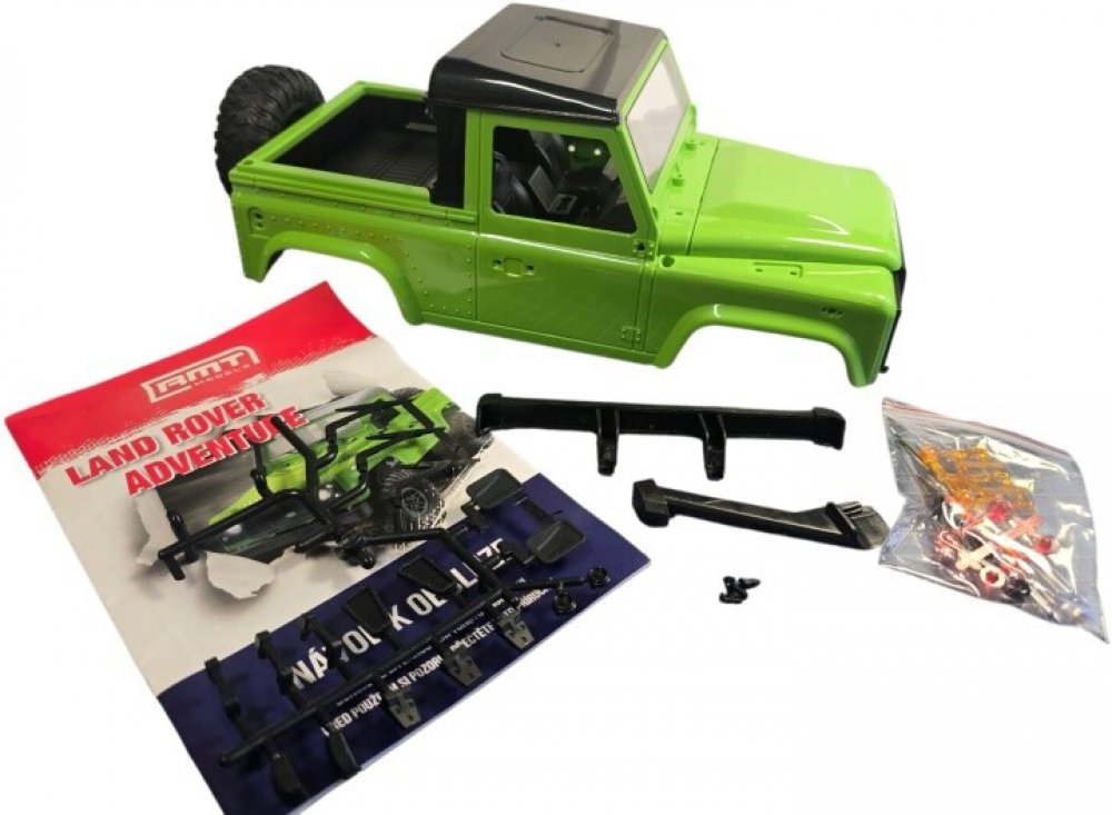 Zelená karoserie pro RC auto RMT LAND ROVER 1/12Model obsahuje doplňky karoserie, krátkou střechu, samolepky. Součástí karoserie je kabel napájení a led osvětlení předních světel bez blinkrů.Pokud doma máte RC model RMT Land Rover, můžete si ho pomocí 4 šroubků přestrojit na jinou barevnou variantu. K tomu vám poslouží tato karoserie.Délka modelu je 33 cm, šířka 15cm, rozvor náprav 19,5 cm, rozchod 13 cm.  Věnujte prosím plnou pozornost tomu jakou verzi Land roveru vlastníte.Díl je vhodný pro:  RC modelpoznávací znakydalší poznávací znakyRMT Land Rover Adventure- bez samolepky  RMT Land Rover Trail- bez samolepky  RMT Land Rover T98- bez samolepky  RMT Land Rover Adventure V2.0- kulatá samolepka RMT- u zadní nápravy ve spodní části modeluRMT Land rover Trail V2.0- kulatá samolepka RMT- v bateriovém prostoru pod akumulátoremRMT Land Rover T98 V2.0- kulatá samolepka RMT- v bateriovém prostoru pod akumulátorem