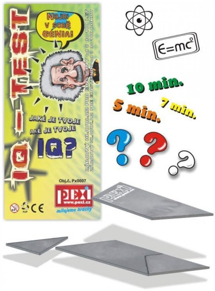 IQ TEST je zábavný hlavolam od 8 do 100 let, který vám provětrá mozkové závity a s trochou rezervy prověří vaše IQ. Můžete si ho vyzkoušet na vlastní kůži nebo prověřte své přátele. Kdo bude rychlejší? Při jeho luštění se 100% pobavíte a možná mezi sebou objevíte dalšího Einsteina.