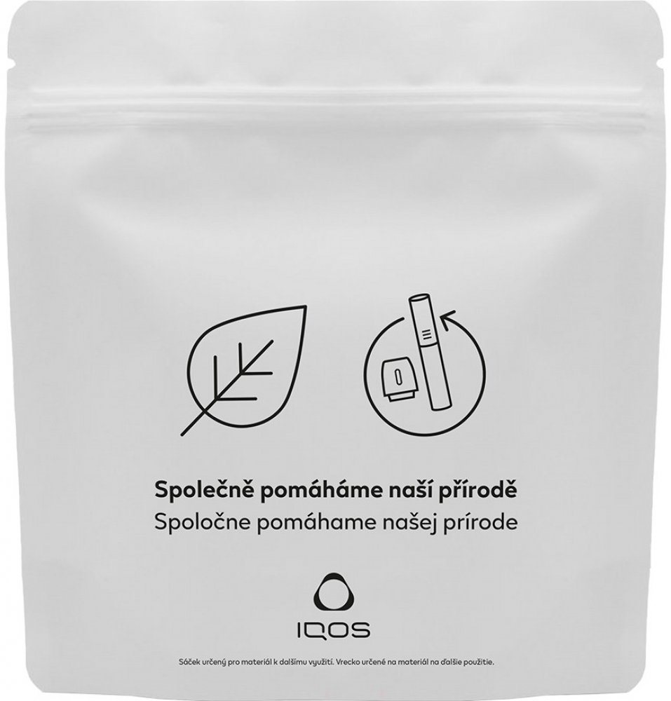 Sběrný sáček na použité náplně: Sbírejte použité náplně (TEREA, LEVIA, HEETS, Fiit, VEEV ONE) a my je předame k recyklaci. Snažíme se snižovat množství odpadu, které vzniká užíváním našich produktů. Náš program na zpětný odběr použitých náplní hraje v rámci této naší snahy klíčovou roli. Naplněný sáček můžete odevzdat obsluze našich prodejen IQOS. IQOS není bez rizika. Obsahuje nikotin, který je n...