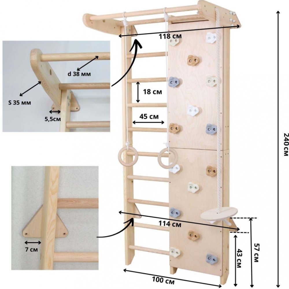 - Šířka: 100 cm (žebřiny 50 cm + lezecká stěna 50 cm)